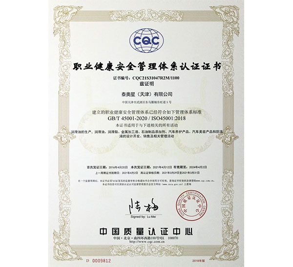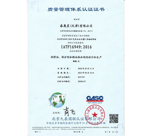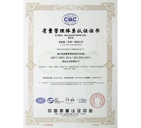 泰奧星(天津)有限公司的IATF16949:2016認(rèn)證證書(shū)