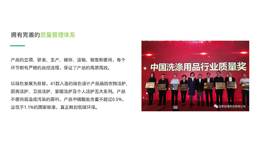 2018年11月,以綠色發(fā)展為目標(biāo)的41款綠傘產(chǎn)品入選綠色設(shè)計(jì)產(chǎn)品。這些產(chǎn)品均不使用易造成污染的原料,磷酸鹽含量不超過0.5%,遠(yuǎn)低于1.1%的國家標(biāo)準(zhǔn),真正做到低碳環(huán)保。同年,綠傘榮獲中國洗滌用品工業(yè)協(xié)會頒發(fā)的“中國洗滌用品行業(yè)質(zhì)量獎(jiǎng)”,這一獎(jiǎng)項(xiàng)的頒發(fā)充分肯定了綠傘一直以來嚴(yán)把質(zhì)量關(guān)、綠色環(huán)保的發(fā)展戰(zhàn)略。