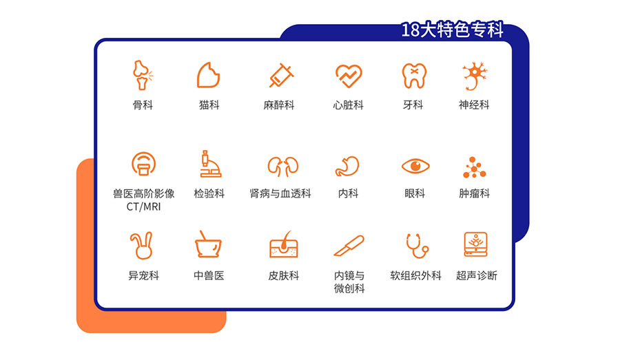 瑞辰旗下各醫(yī)院在全科基礎(chǔ)上堅(jiān)持發(fā)展特色??漆t(yī)療,樹立??苹庾R(shí),截至2023年5月,集團(tuán)建立了獸醫(yī)高階影像CT/MRI、超聲診斷、內(nèi)科、貓科、心臟科、皮膚科、腫瘤科、異寵科、眼科、骨科、牙科、神經(jīng)科、軟組織外科、內(nèi)鏡與微創(chuàng)科、檢驗(yàn)科、腎病與血透科、麻醉科、中獸醫(yī)共18大特色???,并成立18大專科組,其成員均為集團(tuán)內(nèi)優(yōu)秀的中、青年獸醫(yī)師。成立至今,集團(tuán)內(nèi)已有共計(jì)16家醫(yī)院成功評定授牌為“五級特色??漆t(yī)院”,在特色??漆t(yī)療道路上邁進(jìn)跨越式的一大步。