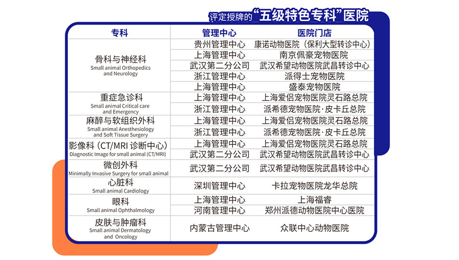 為合理利用醫(yī)療資源,提高醫(yī)院科學(xué)管理水平與醫(yī)療服務(wù)質(zhì)量,保障伴侶動(dòng)物的健康,集團(tuán)進(jìn)一步調(diào)整與健全三級醫(yī)療預(yù)防體系,建立醫(yī)院評審制度,根據(jù)醫(yī)院的功能定位、診療任務(wù)、設(shè)施條件、學(xué)科發(fā)展建設(shè)、醫(yī)療服務(wù)質(zhì)量和科學(xué)管理等方面的綜合水平,對集團(tuán)內(nèi)所有醫(yī)院進(jìn)行科學(xué)分級管理。