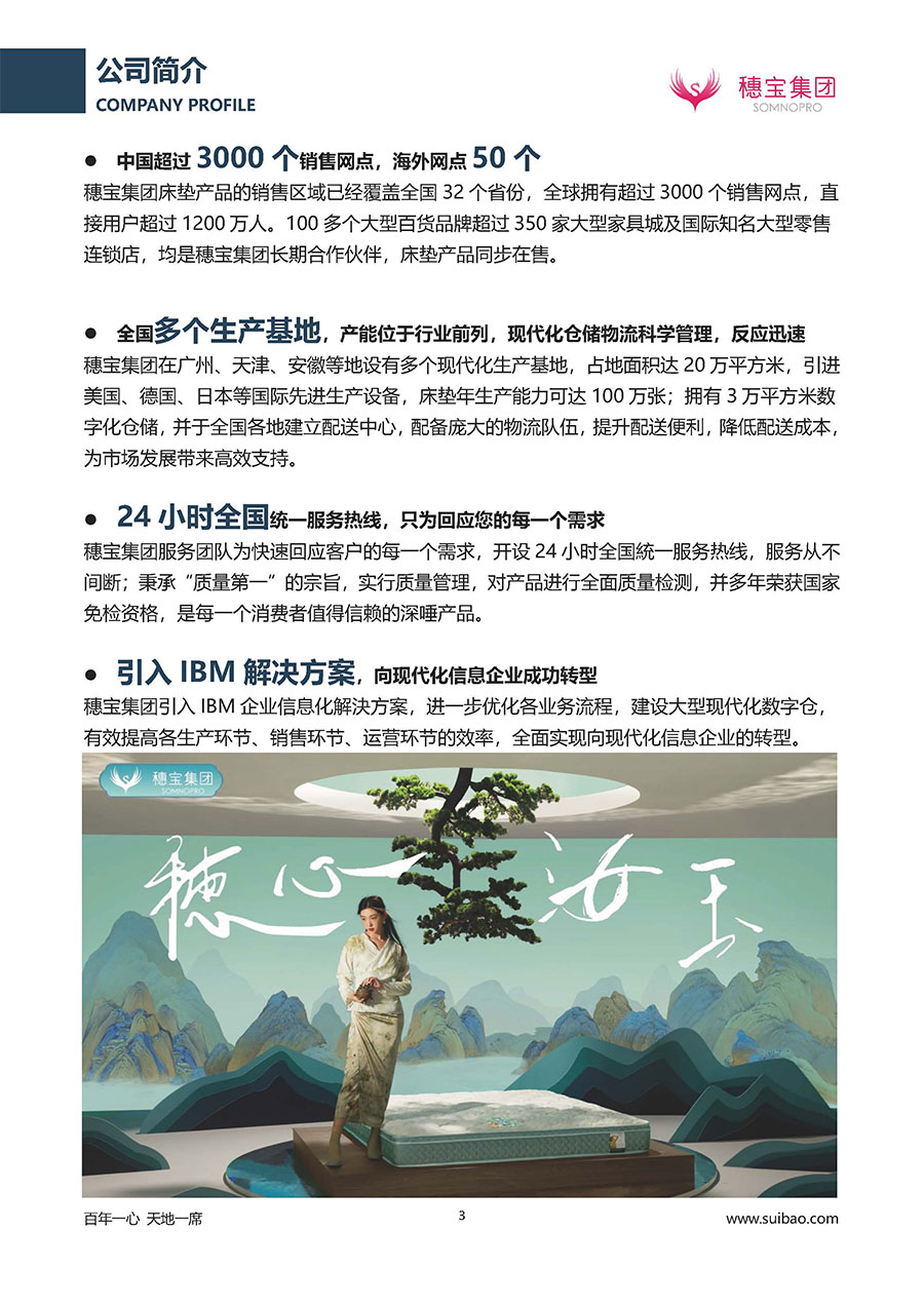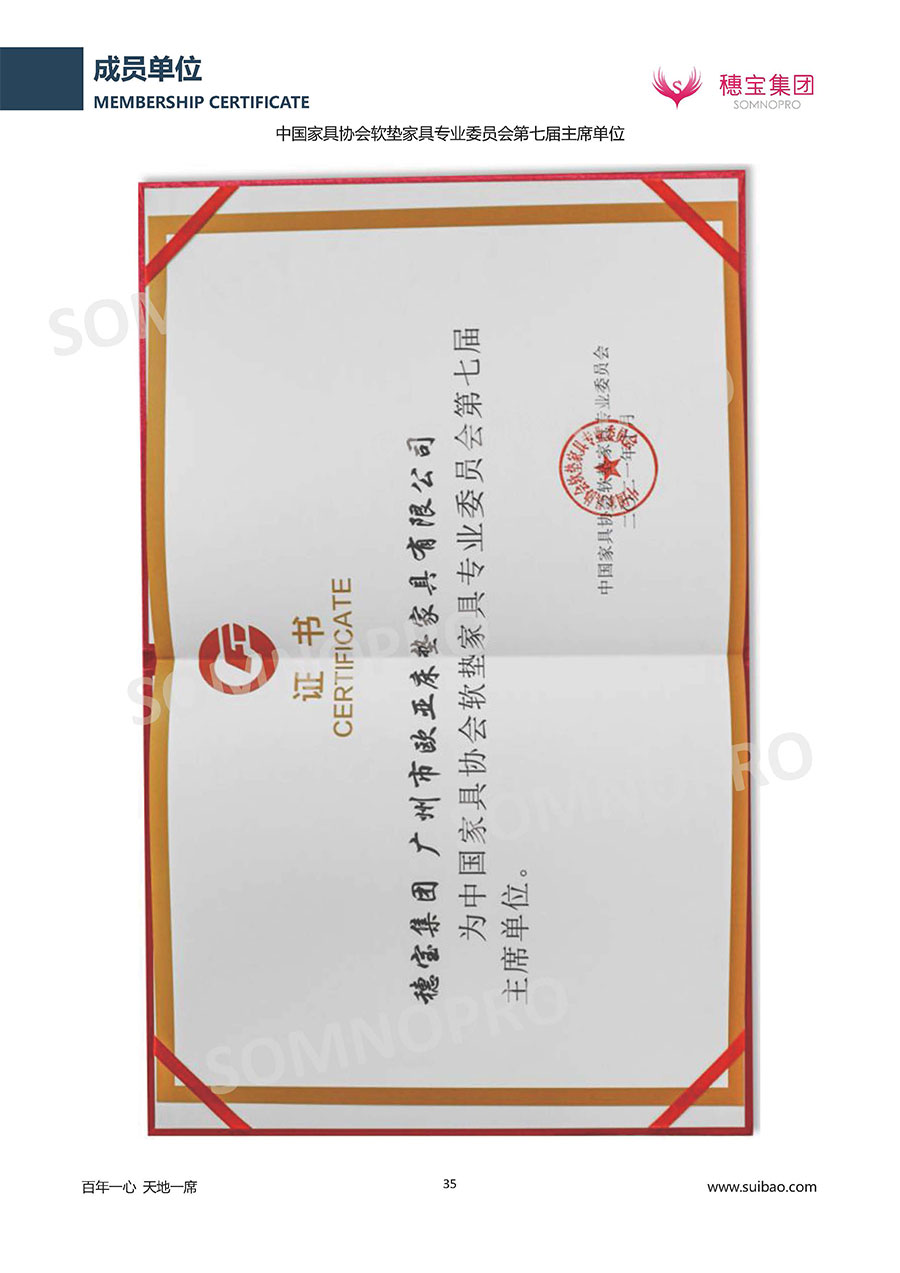 半個世紀的付出,穗寶集團在深度睡眠領域收獲非凡成就,贏得業(yè)界與社會的一致贊譽。作為大家居行業(yè)的品質倡導者,穗寶集團不斷創(chuàng)新,豐富品牌實力,致力推動中國床墊產(chǎn)業(yè)發(fā)展。至今,穗寶集團旗下?lián)碛卸鄠€來自世界各地的優(yōu)質品牌,包括:穗寶、詩貝艾爾、百納璐詩、睡客小鎮(zhèn)、Mr.Z早先生等;此外,穗寶集團從世界各地甄選適合不同消費者的優(yōu)質睡眠產(chǎn)品,定制屬于您的睡眠空間。如今,穗寶集團形成以研發(fā)、生產(chǎn)和銷售床墊為主營業(yè)務,涉及家具、家居裝飾、酒店配套等多項業(yè)務的企業(yè)群體。