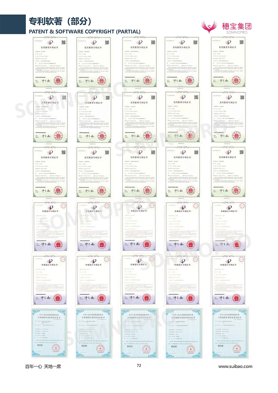 穗寶集團遍訪全球,深度整合世界優(yōu)質資源,專注睡眠研究,與世界家具材料行業(yè)領導者禮恩派集團結成戰(zhàn)略伙伴,成立睡眠研究中心和彈簧網(wǎng)檢測中心,引入床墊鋪面耐久性測試儀,材料拉力測試儀,床墊撓度曲線測試儀,為產(chǎn)品注入優(yōu)秀基因;成功研發(fā)推出IFEEL深睡感知系統(tǒng)、X7研發(fā)系統(tǒng),關注消費者每一個細微的睡眠需求,致力于以科學的方式創(chuàng)造優(yōu)異的物理與心理助眠條件,幫助現(xiàn)代人獲得優(yōu)質深度睡眠;不斷創(chuàng)新進取,軀位步技術、T-GUARD衡力支承系統(tǒng)等多項成果獲國內(nèi)國際專利。