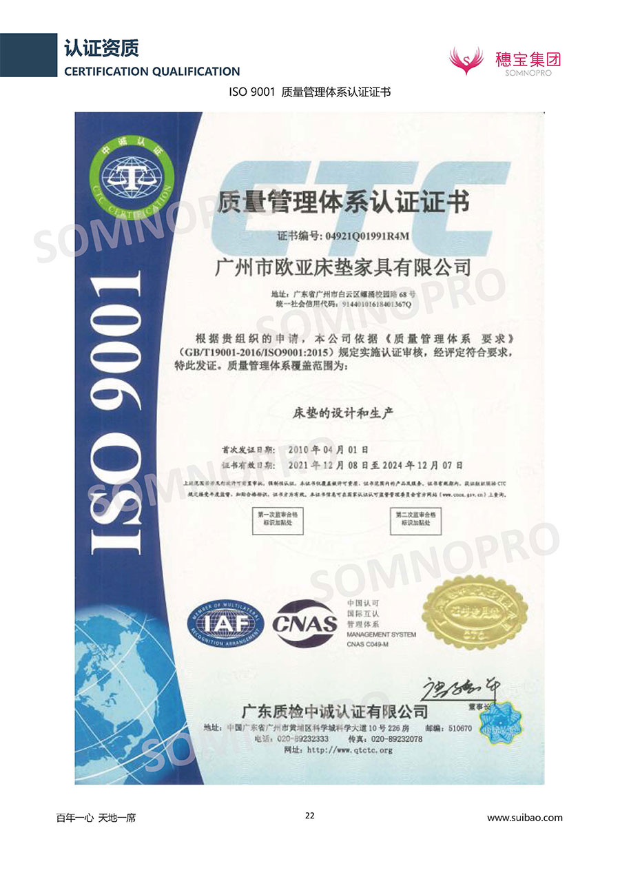 本著高品質、高效率、重管理的原則,穗寶已通過ISO9001質量管理體系認證證書、ISO14001環(huán)境管理體系認證證書、ISO45001職業(yè)健康安全管理體系認證證書、中國環(huán)境標志產(chǎn)品認證證書、家居綠色環(huán)保領跑品牌、綠色正品家居品牌、企業(yè)標準“綠色領跑者”證書、CMS測量管理體系證書、CMS測量管理體系證書附件、廣東省“守信用重合同”企業(yè)、廣州歐亞-納稅信用A級納稅人(連續(xù)5年:2018-2022)、2024年中國500最具價值品牌,品牌價值高達302.89億元、廣東高價值商標品牌(穗寶)、廣東省重點商標保護名錄納入證明、廣州市勞動關系和諧企業(yè)AA級。穗寶自創(chuàng)立以來,不斷致力于新產(chǎn)品的設計與研發(fā),多次在國內(nèi)家具展會屢獲獎項,產(chǎn)品暢銷國內(nèi)外,深受客戶一致好評。
