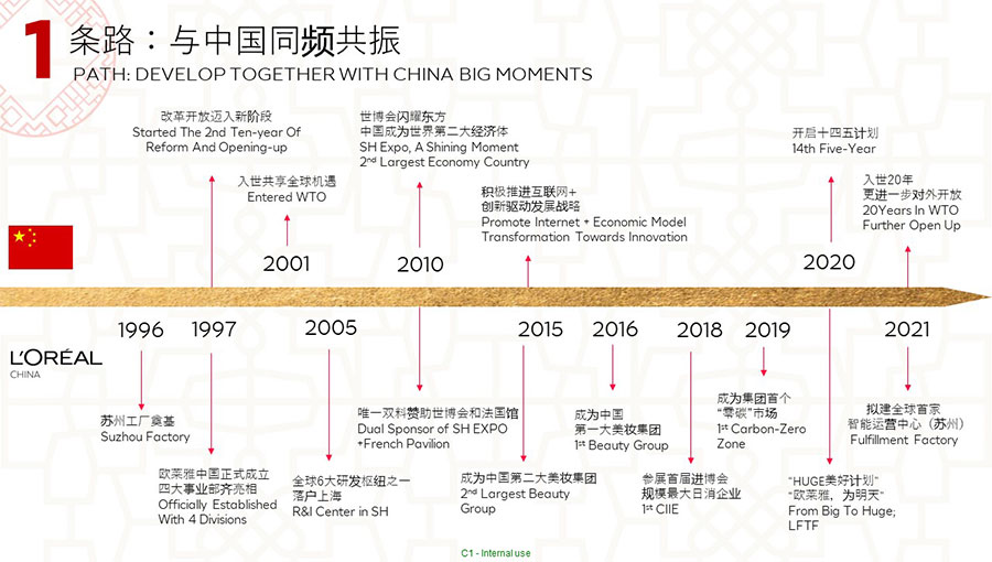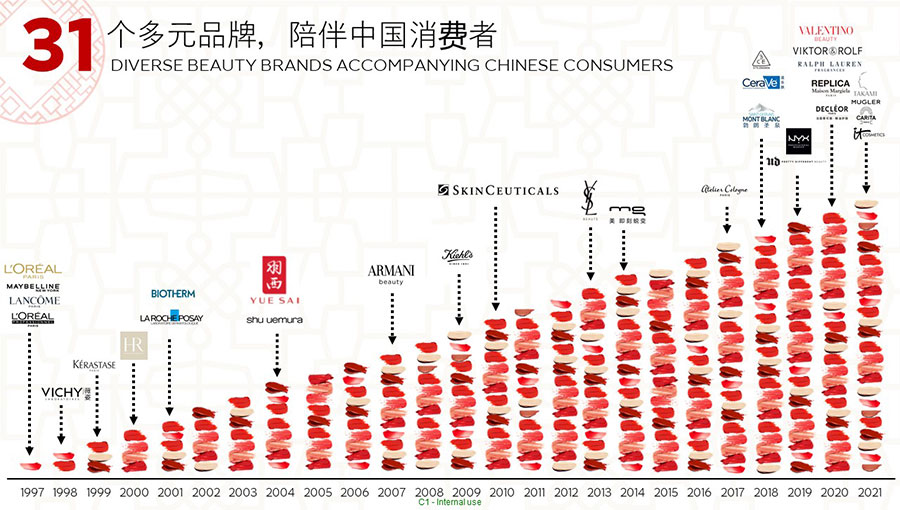 歐萊雅在1997年進(jìn)入中國。歐萊雅中國的總部位于上海,并在全國設(shè)有五個(gè)辦事處,目前在中國擁有31個(gè)品牌,一個(gè)研發(fā)和創(chuàng)新中心,兩家工廠分別位于蘇州和宜昌,共有超過14,000名員工。經(jīng)過25年高質(zhì)量、穩(wěn)健、可持續(xù)的增長,中國已成為歐萊雅集團(tuán)全球第二大市場(chǎng),該集團(tuán)北亞區(qū)美妝黃金三角洲的總部,以及該集團(tuán)美妝科技三大樞紐之一。作為中國最佳企業(yè)公民之一,歐萊雅中國始終貫徹落實(shí)該集團(tuán)提出的“歐萊雅,為明天——可持續(xù)發(fā)展承諾2030”,是該集團(tuán)第1個(gè)完整運(yùn)營設(shè)施“零碳”的市場(chǎng),并積極通過社會(huì)責(zé)任項(xiàng)目,持續(xù)貢獻(xiàn)中國社會(huì)的美好發(fā)展。