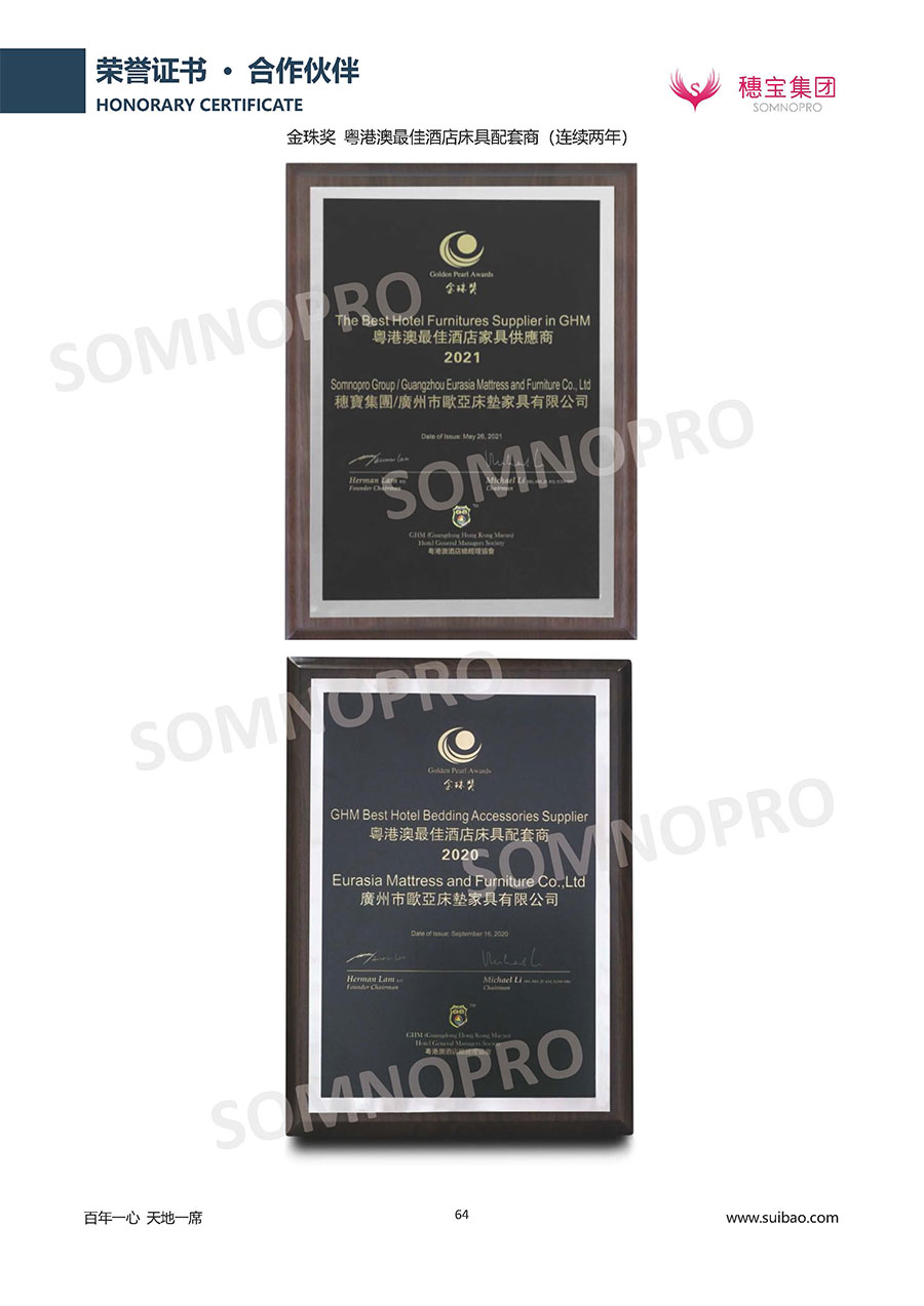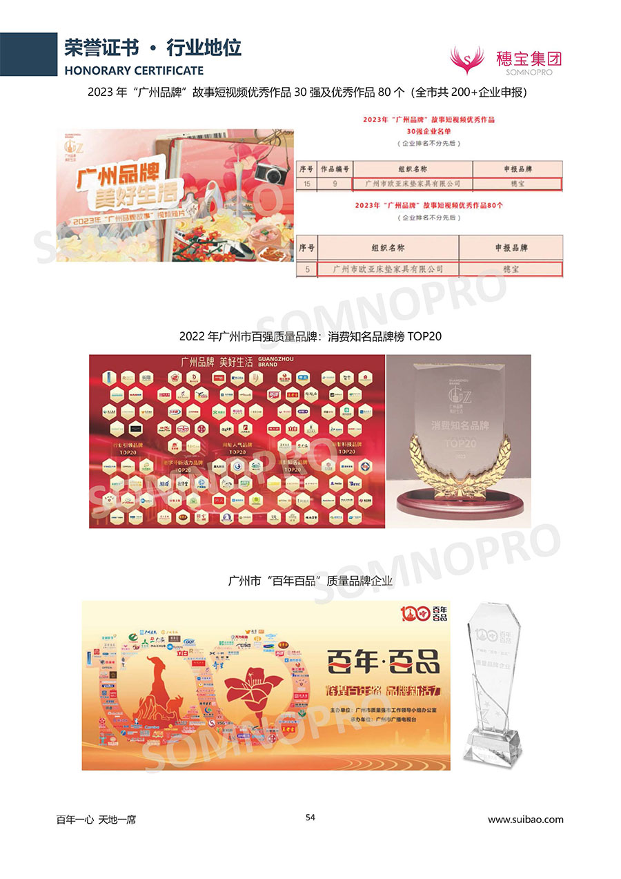 自1971年獨立研發(fā)生產(chǎn)出專屬國人的彈簧床墊,穗寶關于優(yōu)質深度睡眠的研究已有半個世紀的歷史。穗寶一直專注床墊,專注中國消費者的睡眠研究,針對中國人特點進行優(yōu)化創(chuàng)新,不斷提升國人的睡眠體驗,只為成就每個晚上8小時的優(yōu)質深度睡眠。憑借不斷革新的研發(fā)科技和深受消費者信賴的產(chǎn)品品質,穗寶集團旗下品牌和產(chǎn)品屢獲國內(nèi)外大獎,連續(xù)20年榮膺中國500最具價值品牌,品牌價值高達302.89億元。