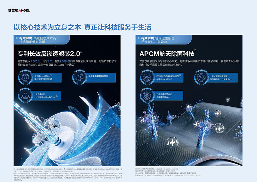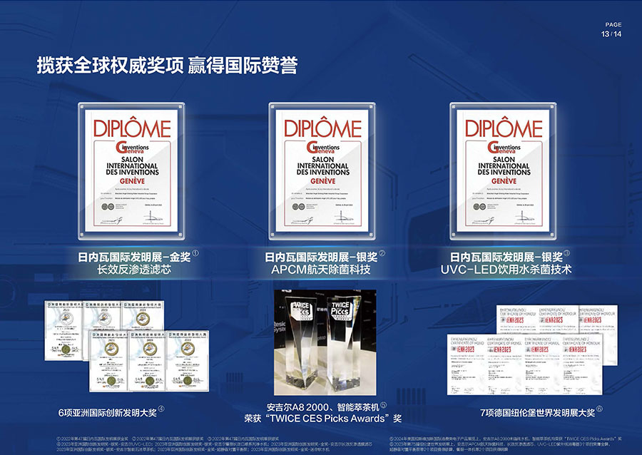 37年來,安吉爾始終堅持科技創(chuàng)新,不斷引領(lǐng)行業(yè)技術(shù)升級。參與17項國家及行業(yè)標(biāo)準(zhǔn)制修訂,累計獲得900余項專利,建立4大水質(zhì)實(shí)驗室。2023年,安吉爾憑實(shí)力斬獲全球9項發(fā)明獎,包含3項日內(nèi)瓦國際發(fā)明展獎項,6項亞洲創(chuàng)新發(fā)明展獎項。