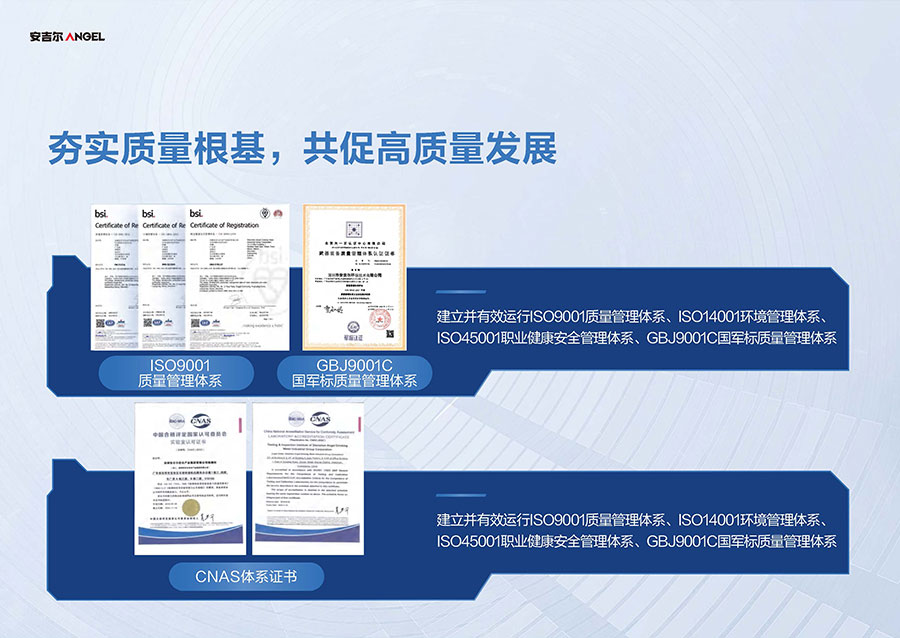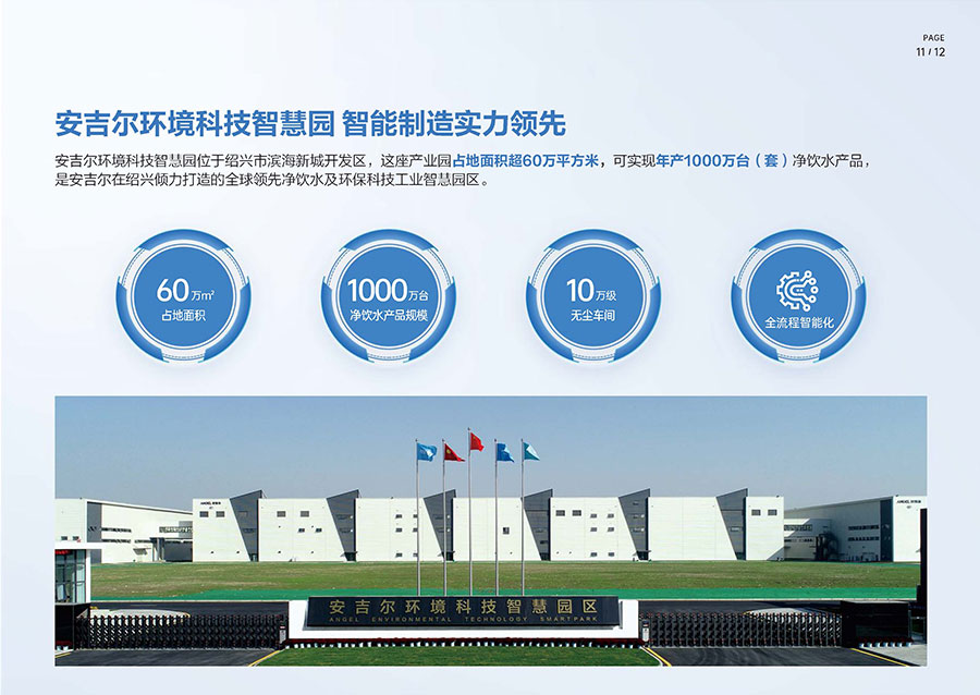 安吉爾擁有三大生產(chǎn)基地,其中安吉爾環(huán)境科技智慧園占地超60萬平方米,可實(shí)現(xiàn)年產(chǎn)1000萬臺(套)的凈飲水產(chǎn)品規(guī)模。安吉爾擁有完整的生產(chǎn)管理體系,已獲中國CQC、美國UL、美國NSF、加拿大CSA、法國BV、英國ITS、瑞士SGS和德國TüV全球八項權(quán)威機(jī)構(gòu)認(rèn)證。