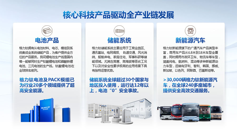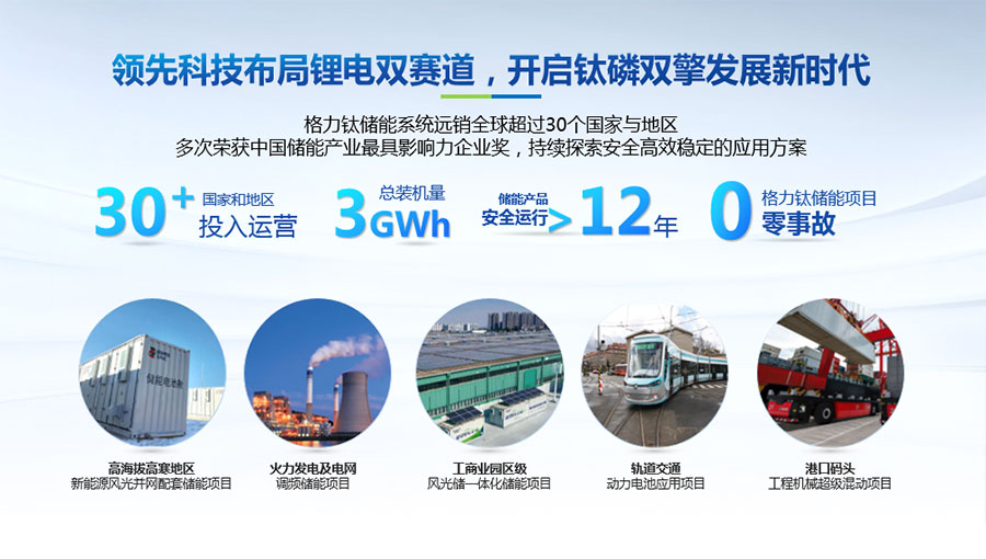 以完善的研發(fā)體系,公司加快技術(shù)創(chuàng)新與產(chǎn)業(yè)升級的步伐。公司研發(fā)的格力鈦電池安全性長期領(lǐng)跑行業(yè),憑借具有高安全、大倍率、快充放、耐寬溫、長壽命等特性,被選為“國家制造業(yè)單項冠軍產(chǎn)品”,廣泛應(yīng)用于新能源汽車以及工商業(yè)園區(qū)、通訊基站、電網(wǎng)調(diào)頻、軌道交通、風(fēng)光消納、船舶岸電、家庭住宅、軍事科研等儲能領(lǐng)域,具有廣闊的市場前景和應(yīng)用價值。目前,格力鈦儲能產(chǎn)品已在丹麥、瑞士、芬蘭等全球30多個國家和地區(qū)使用,新能源汽車產(chǎn)品在北京、杭州、武漢、成都、青島、哈爾濱、包頭、??诘热?40多座城市運營,12年全球零電池事故安全運行。
