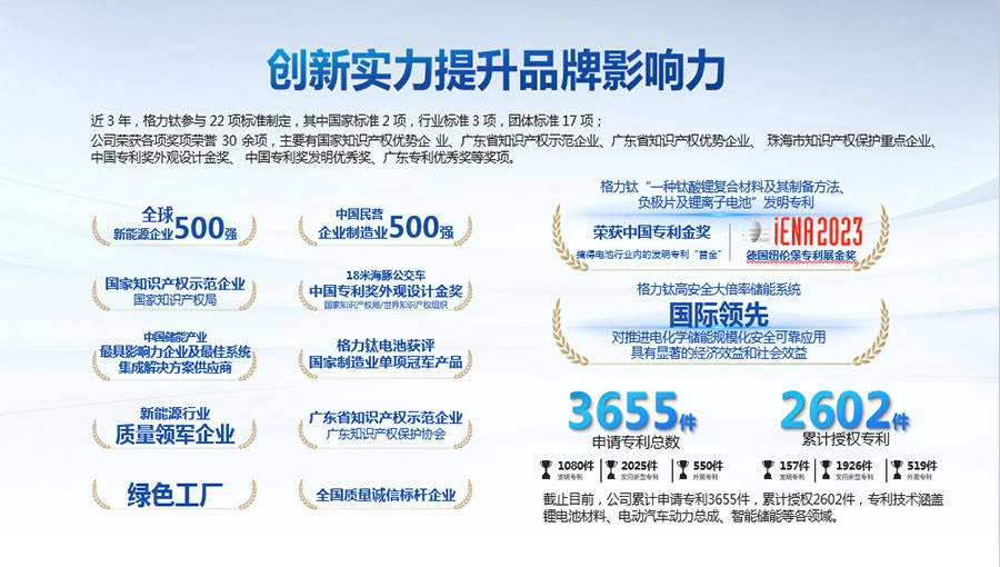 2022年,“一種鈦酸鋰復(fù)合材料及其制備方法、負極片及鋰離子電池”發(fā)明專利獲得中國專利金獎,摘得鋰電池行業(yè)內(nèi)的發(fā)明專利“首金”;2023年,該專利技術(shù)再次斬獲第75屆德國紐倫堡發(fā)明國際金獎。“高安全大倍率儲能系統(tǒng)關(guān)鍵技術(shù)研發(fā)與應(yīng)用”項目被中國機械工業(yè)聯(lián)合會鑒定達到“國際領(lǐng)先”水平。截止目前,公司先后獲得“中國民營企業(yè)制造業(yè)500強”、“全國質(zhì)量信得過產(chǎn)品”、“客車安全技術(shù)成果獎”、“中國儲能產(chǎn)業(yè)最具影響力企業(yè)獎、最佳系統(tǒng)集成商、最佳儲能電池供應(yīng)商”等榮譽,獲得工信部頒發(fā)的“綠色工廠”榮譽稱號;上榜科技部發(fā)布的新能源領(lǐng)域獨角獸企業(yè),多年入選全球新能源企業(yè)500強,入選“全國百佳質(zhì)量檢驗誠信標(biāo)桿企業(yè)”、“國家知識產(chǎn)權(quán)優(yōu)勢企業(yè)”等。
