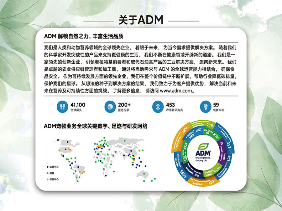 ADM作為人類、動物及寵物營養(yǎng)領(lǐng)域的全球前沿企業(yè),致力于寵物營養(yǎng)領(lǐng)域的創(chuàng)新,不斷開發(fā)出突破性的寵物產(chǎn)品,為中國的養(yǎng)寵家庭提供更加全面、精準(zhǔn)的營養(yǎng)解決方案。