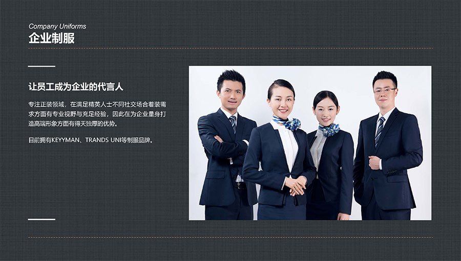 凱門品牌(KEYYMEN):高級職業(yè)裝品牌,企業(yè)形象定制專家。以精湛工藝及最優(yōu)性價比打造高品質(zhì)、個性時尚的企業(yè)形象,專屬于那些為理想、為事業(yè)打拼,并在成功過程中享受生活的職場團隊及精英人士。