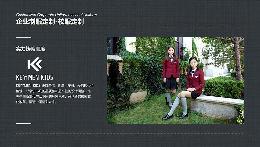 凱門學生裝(KEYYMEN KIDS)秉持自信、創(chuàng)造、多彩、愛的核心價值觀,堅持“領先一步,步步領先”的品牌理念,致力于打造最具影響力的學生裝品牌,為中國青少年形象代言,以卓爾不凡的品質(zhì)和彰顯個性的設計風格,培養(yǎng)中國青少年與眾不同的形象氣質(zhì)。