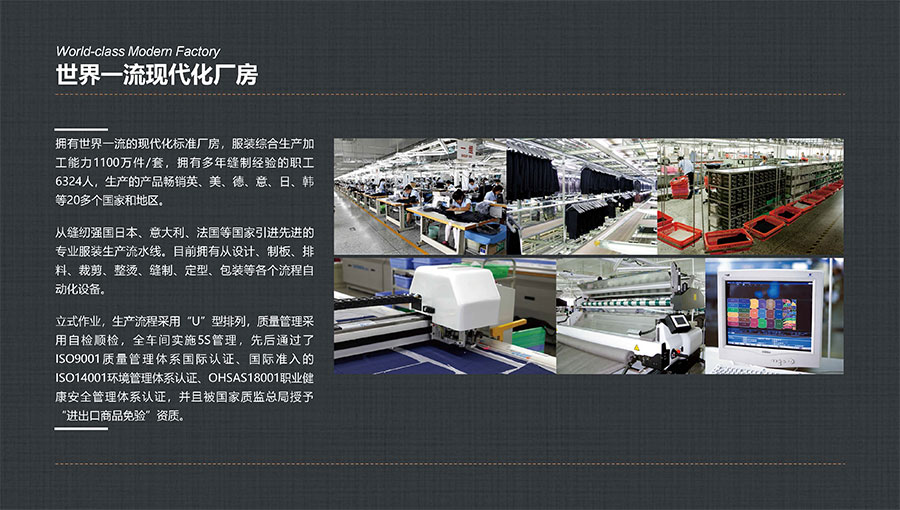 多年來,大楊集團深耕主業(yè)、堅守實業(yè),積極開拓國內(nèi)外高端服裝市場,年服裝綜合生產(chǎn)加工能力1100萬件/套,其中年定制服裝生產(chǎn)數(shù)量穩(wěn)居全球第一。年西服出口量600萬件/套,連續(xù)多年排名全國第一。先后被評為世界服裝行業(yè)五百強企業(yè)、全國服裝行業(yè)十強/百強企業(yè)、國家重點扶持的中國名牌出口企業(yè)、國家級重合同守信譽單位、國家級服務型制造示范企業(yè)、國家重點培育紡織服裝百家品牌、遼寧省數(shù)字化轉(zhuǎn)型標桿企業(yè),榮獲全國五一勞動獎狀、全國文明單位、全國紡織行業(yè)先進集體、全國抗擊新冠肺炎疫情先進民營企業(yè)、省長質(zhì)量獎等稱號,入選“中國服裝智能制造技術創(chuàng)新戰(zhàn)略聯(lián)盟”創(chuàng)始會員。同時,大楊集團還在同行業(yè)中率先通過“AAA級兩化融合管理體系”評定,以及ISO9001質(zhì)量管理體系國際認證、國際準入的ISO14001環(huán)境管理體系認證、ISO45001職業(yè)健康安全管理體系認證。
