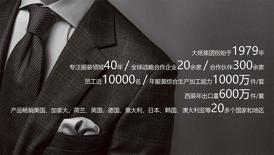 大楊集團創(chuàng)建于1979年,總部位于遼寧省大連市,主要生產(chǎn)和銷售各類中高檔服裝產(chǎn)品為主的國際化大型服裝企業(yè),以西裝縫制享譽全球,是世界重要的西裝生產(chǎn)加工基地?,F(xiàn)有直屬(控股)成員企業(yè)20家,員工4500人??毓勺庸敬筮B大楊創(chuàng)世股份有限公司2000年在上海證券交易所上市,并于2016年完成重大資產(chǎn)重組。