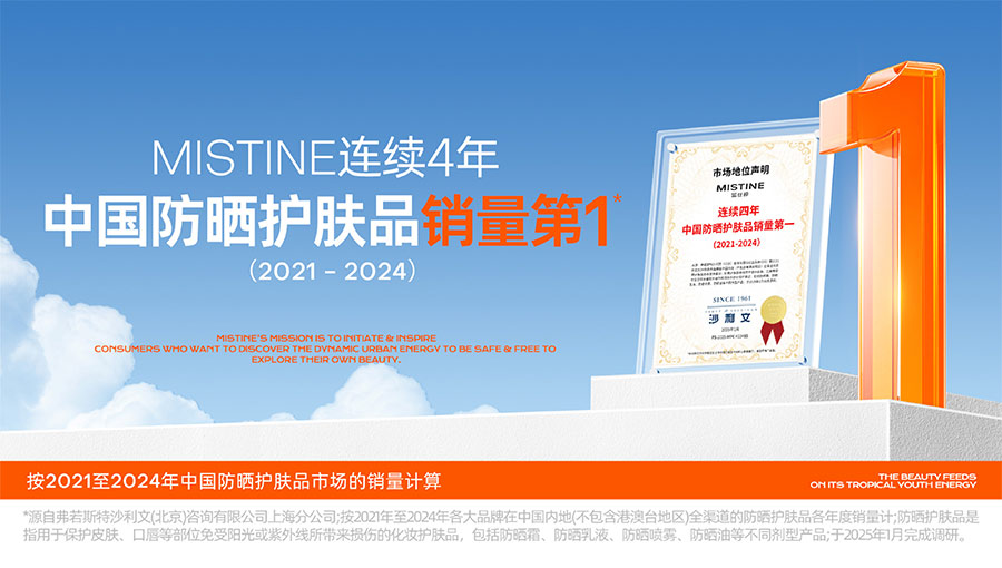 歷經(jīng)37年的科研沉淀,MISTINE蜜絲婷品牌在防曬、護膚、底妝、彩妝多個品類的產(chǎn)品開發(fā)中,堅持圍繞對“光”的研究,在光與防曬護膚、光與色彩妝容的產(chǎn)品應用層面,研究光、理解光、樂享光,持續(xù)不斷地提供產(chǎn)品解決方案,滿足消費者對防曬美白、潮流妝容、護膚健康的需求。防曬系列產(chǎn)品作為MISTINE蜜絲婷的知名品類,以物化生一體的全鏈路防曬技術(shù),憑借高倍防曬、清爽膚感的高功效和高質(zhì)價比勝出,自2021年連續(xù)三年位于中國防曬護膚品銷量領先。