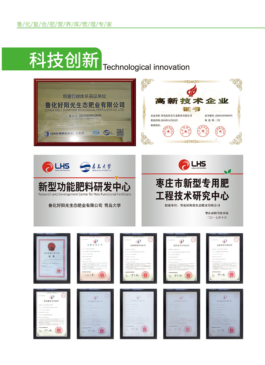魯化好陽光秉承“營養(yǎng)庫管理專家”的理念,致力于肥料的高效利用,服務農(nóng)業(yè)生產(chǎn)。魯化好陽光已獲得國家高新技術企業(yè)認證、ISO9001質(zhì)量體系認證等多項管理資質(zhì)證書。和青島大學、滕州市馬鈴薯品牌培育產(chǎn)業(yè)發(fā)展研究所等多所大學、研究機構合作,建立新型肥料研發(fā)中心,取得了豐碩成果。