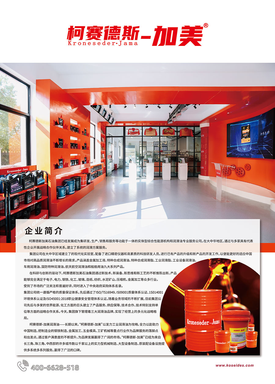 主要產(chǎn)品:柯賽德斯-加美Kroneseder?Jama、中訊高科ZHONGXUN、柯賽德Kroneseder三大品牌,產(chǎn)品涵蓋金屬加工油液、特種合成潤滑油、特種合成潤滑脂、工業(yè)潤滑脂、工業(yè)設備潤滑油、車用潤滑油、國防特種潤滑油、航天航空潤滑油和船舶用油九大系列產(chǎn)品