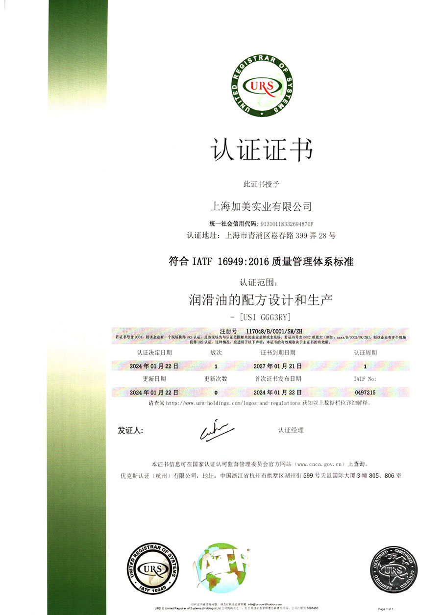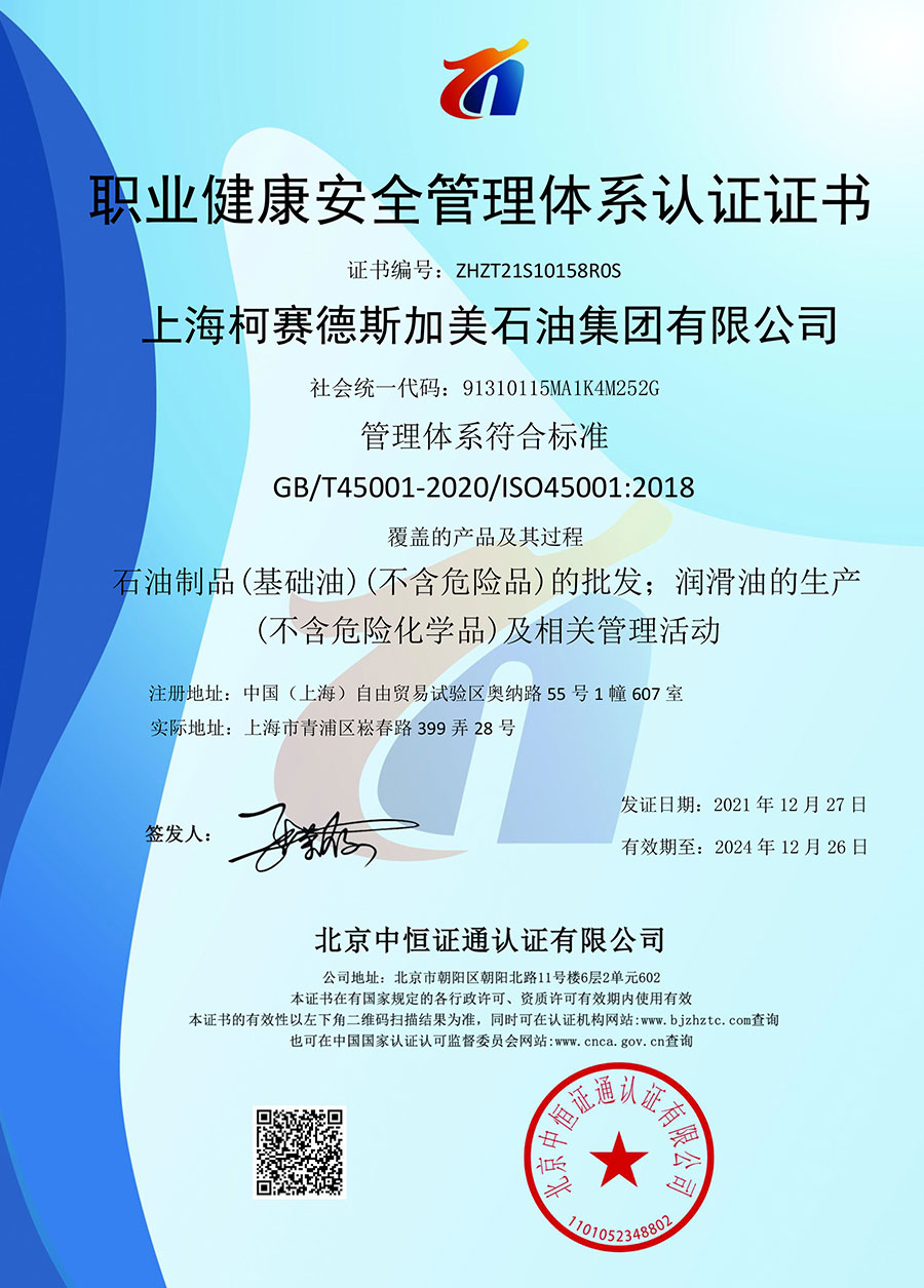 柯賽德斯集團公司統(tǒng)一遵循嚴格的質(zhì)量保證體系,先后通過了武器裝備質(zhì)量管理體系認證GJB9001C-2017、ISO/TS16949、IS09001質(zhì)量體系認證、1S014001環(huán)境體系認證及ISO45001:2018職業(yè)健康安全管理體系認證。隨著業(yè)務領域的不斷擴展,目前柯賽德斯集團公司先后與多家世界能源、化工方面的巨頭建立了產(chǎn)品服務、供應保障、技術(shù)合作、技術(shù)特別支持單位等方面的戰(zhàn)略合作關(guān)系。今天,柯賽德斯集團公司旗下管理著三大潤滑油品牌,實現(xiàn)了經(jīng)營上的多元化戰(zhàn)略格局。