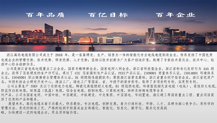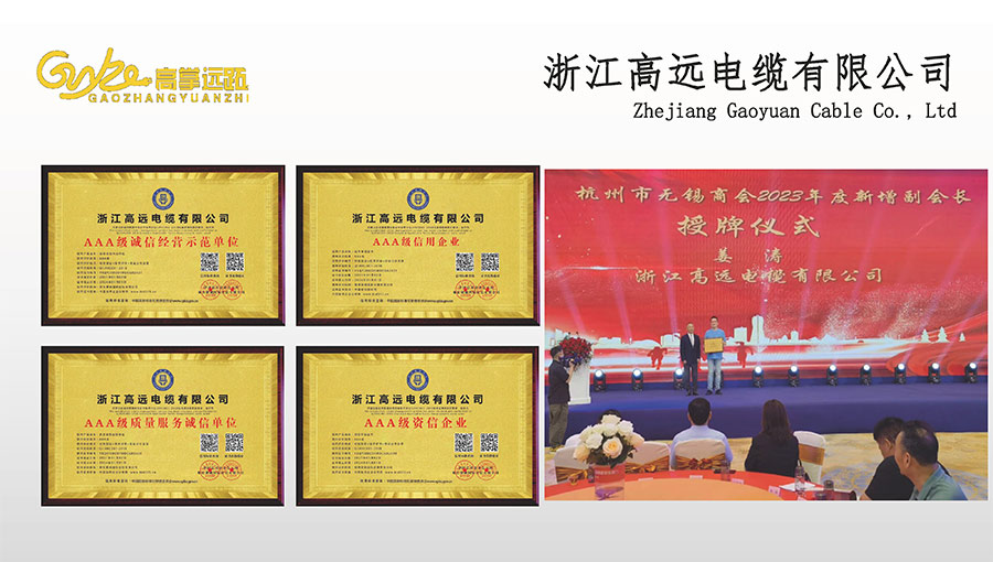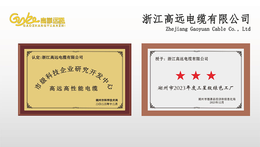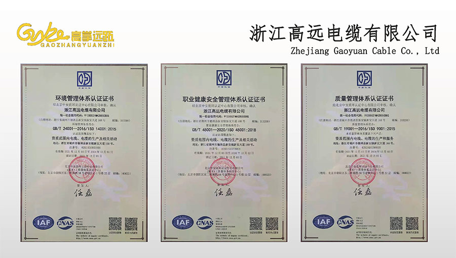 高遠(yuǎn)電纜是浙江省電線電纜重點(diǎn)工業(yè)企業(yè),浙江省專精特新企業(yè)、浙江省科技型企業(yè),浙江省標(biāo)準(zhǔn)化良好行為AAA級企業(yè);獲得了國家頒發(fā)的生產(chǎn)許可證,通過了CCC國家強(qiáng)制性產(chǎn)品認(rèn)證,ISO9001質(zhì)量體系認(rèn)證,ISO14001環(huán)境體系認(rèn)證,OHSAS18001職業(yè)健康安全管理體系認(rèn)證,PCCC產(chǎn)品認(rèn)證、B1級燃燒性能授權(quán)書;榮獲浙江省著名商標(biāo),浙江省重合同守信譽(yù)企業(yè),浙江省優(yōu)質(zhì)產(chǎn)品,市級研究開發(fā)中心,清潔工廠,綠色工廠等國家、省、市授權(quán)的榮譽(yù)稱號,取得了多項(xiàng)發(fā)明專利、實(shí)用型專利。