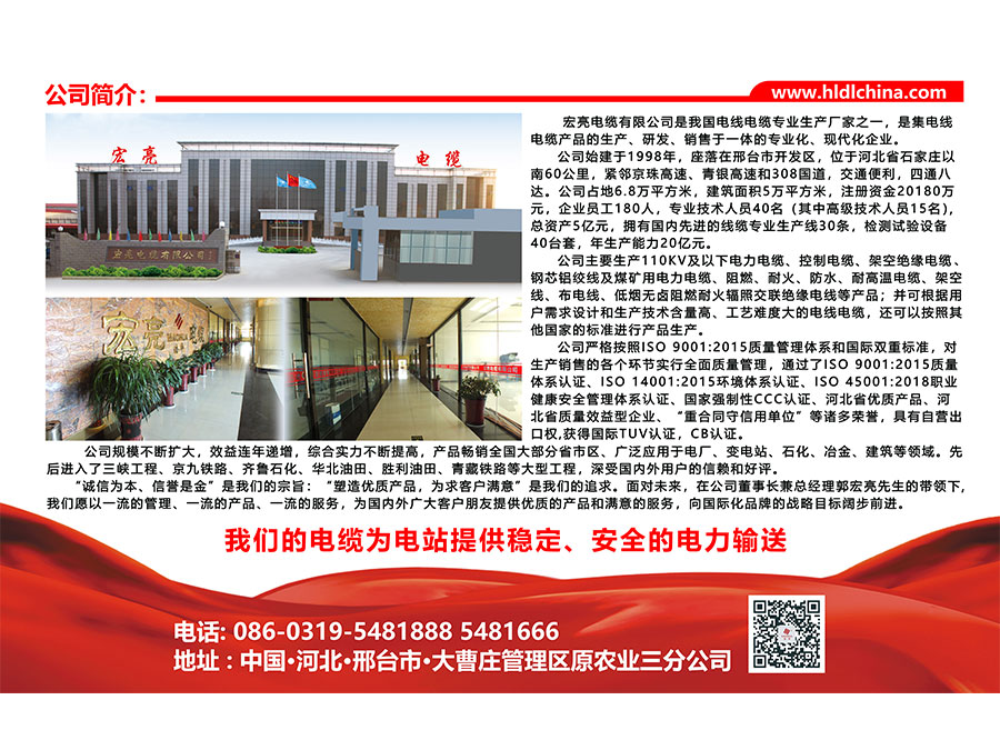 宏亮電纜有限公司是我國電線電纜專業(yè)生產廠家之一,是集電線電纜產品的生產、研發(fā)、銷售于一體的專業(yè)化、現(xiàn)代化企業(yè)。宏亮電纜始建于1988年,坐落在邢臺市開發(fā)區(qū),位于河北省石家莊以南60公里,緊鄰京珠高速、青銀高速和308國道,四通八達。