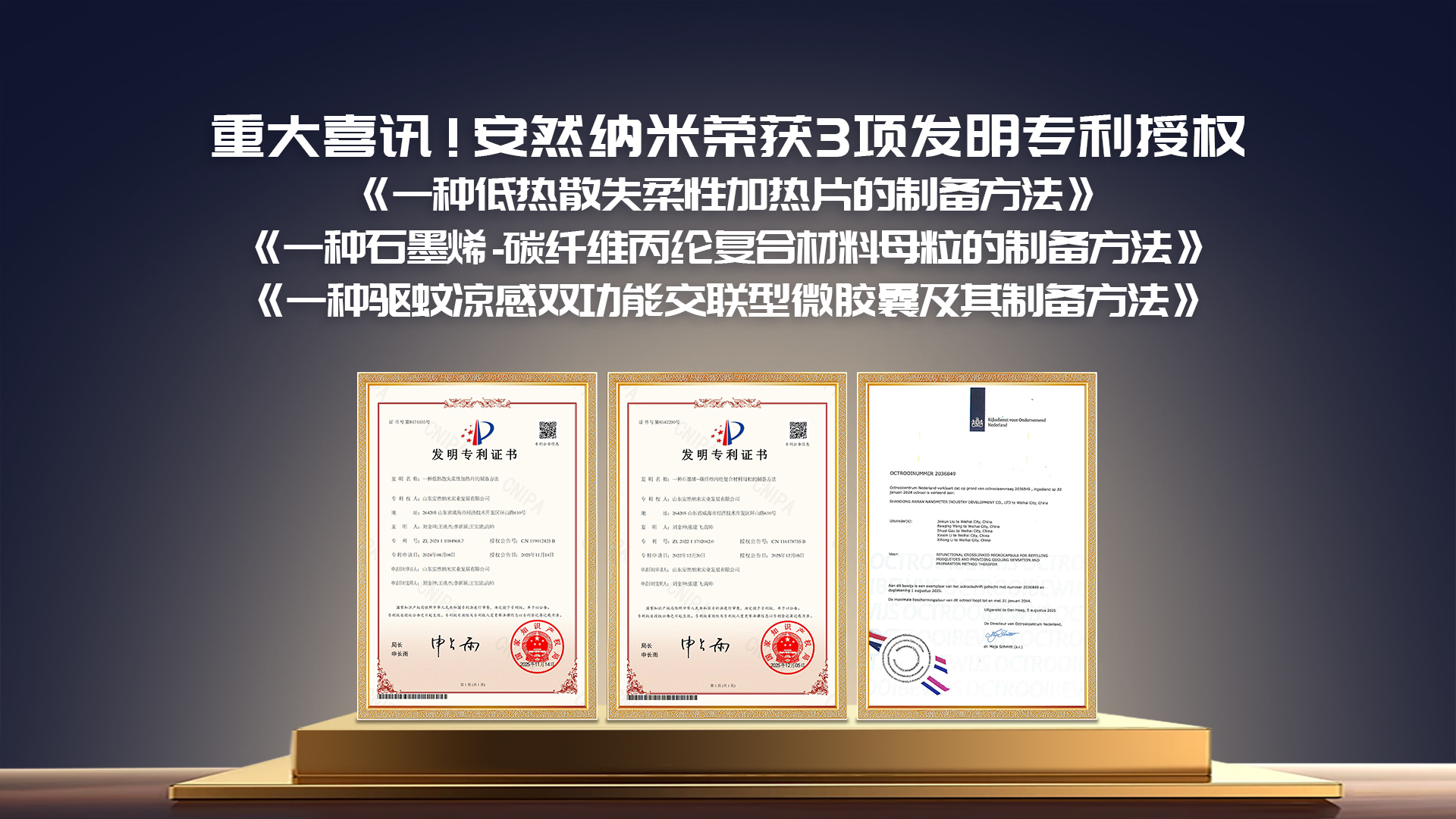 其中,《一種低熱散失柔性加熱片的制備方法》與《一種石墨烯-碳纖維丙綸復(fù)合材料母粒的制備方法》獲國家知識產(chǎn)權(quán)局授權(quán),《一種驅(qū)蚊涼感雙功能交聯(lián)型微膠囊及其制備方法》獲荷蘭發(fā)明專利授權(quán),標(biāo)志著安然在功能材料與健康紡織領(lǐng)域的技術(shù)實(shí)力再次獲得國際國內(nèi)雙重肯定。