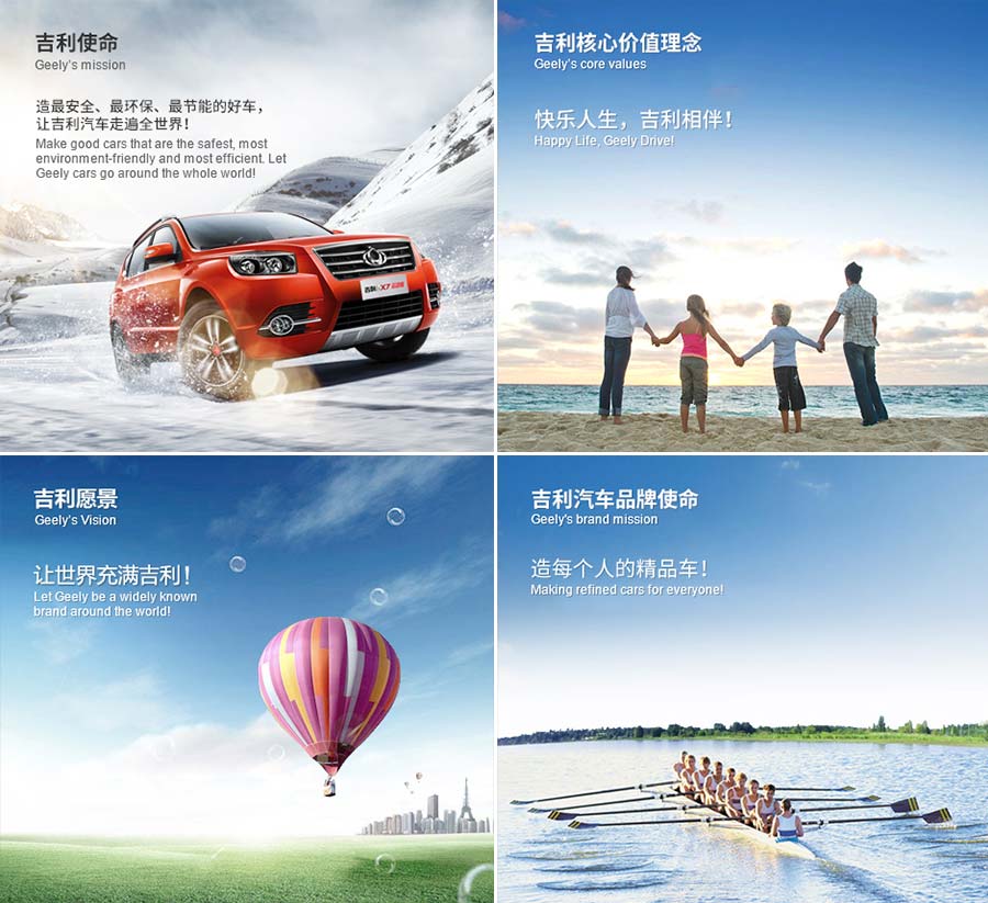 本著“總體跟隨、局部超越、重點(diǎn)突破、招賢納士、合縱連橫、后來(lái)居上”的發(fā)展戰(zhàn)略和“快樂(lè)人生,吉利相伴”的核心價(jià)值理念,浙江吉利控股集團(tuán)將堅(jiān)持走科技創(chuàng)新的道路,發(fā)揮團(tuán)隊(duì)智慧,打造具有國(guó)際影響力和全球競(jìng)爭(zhēng)力、受人尊敬的世界500強(qiáng)汽車(chē)企業(yè)集團(tuán),為中國(guó)汽車(chē)工業(yè)的崛起,為實(shí)現(xiàn)“讓吉利汽車(chē)走遍全世界”的美麗追求而奮斗!