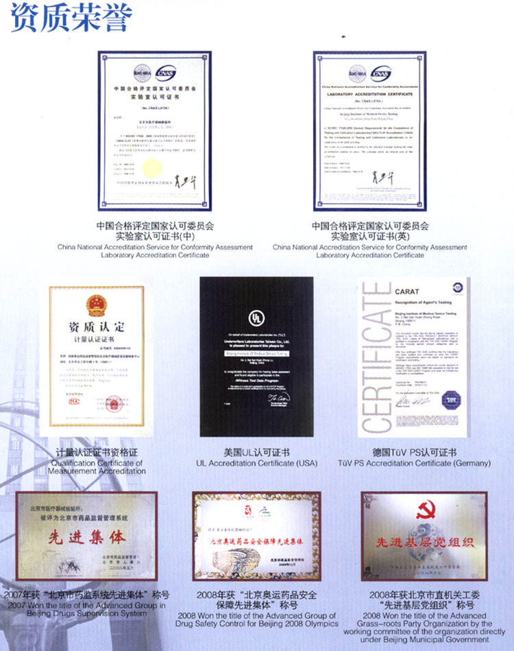 北京市醫(yī)療器械檢驗(yàn)所(國(guó)家食品藥品監(jiān)督管理局北京醫(yī)療器械質(zhì)量監(jiān)督檢驗(yàn)中心,以下簡(jiǎn)稱“北檢所”)是中國(guó)合格評(píng)定國(guó)家認(rèn)可委員會(huì)(CNAS)、中國(guó)國(guó)家認(rèn)證認(rèn)可監(jiān)督管理委員會(huì)(CNCA)、國(guó)家食品藥品監(jiān)督管理局(SFDA)等部門認(rèn)可授權(quán)的一所綜合性醫(yī)療器械產(chǎn)品檢測(cè)機(jī)構(gòu)。經(jīng)CNAS授權(quán)的檢驗(yàn)范圍涵蓋醫(yī)用電子、醫(yī)用射線、核醫(yī)學(xué)、電聲學(xué)、體外診斷系統(tǒng)、一次性醫(yī)療產(chǎn)品、醫(yī)用防護(hù)用品、醫(yī)用橡膠制品、口腔材料、生物安全柜、電磁兼容、生物相容性等專業(yè)領(lǐng)域,檢驗(yàn)項(xiàng)目涉及472項(xiàng);經(jīng)SFDA授權(quán)檢測(cè)項(xiàng)目達(dá)599項(xiàng),承擔(dān)著授權(quán)范圍內(nèi)醫(yī)療器械產(chǎn)品監(jiān)督抽驗(yàn)檢驗(yàn)、注冊(cè)檢驗(yàn)、認(rèn)證檢驗(yàn)、進(jìn)出口商品檢驗(yàn)、科技成果鑒定檢驗(yàn)以及委托檢驗(yàn)、仲裁檢驗(yàn)等檢測(cè)任務(wù);2002年,成為中國(guó)質(zhì)量認(rèn)證中心(CQC)簽約實(shí)驗(yàn)室,承擔(dān)醫(yī)用X射線診斷設(shè)備、心電圖機(jī)、血液透析裝置和橡膠避孕套的強(qiáng)制性產(chǎn)品安全認(rèn)證檢測(cè)任務(wù)。此外,該所先后獲得TüV PS、UL等國(guó)際權(quán)威認(rèn)證機(jī)構(gòu)的認(rèn)可,是目前國(guó)內(nèi)開(kāi)展檢驗(yàn)業(yè)務(wù)專業(yè)最全面的醫(yī)療器械檢驗(yàn)機(jī)構(gòu)。