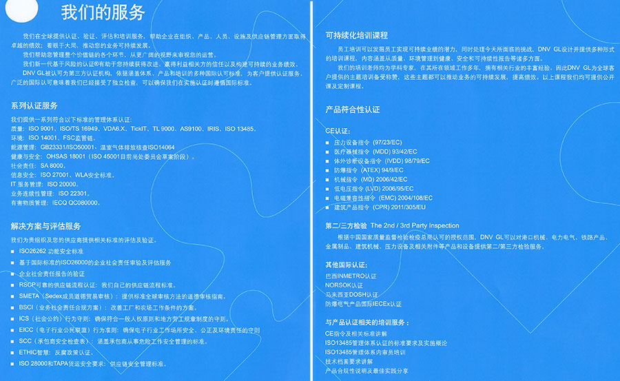 作為一家世界領(lǐng)先的提供管理服務(wù)的國際機構(gòu),DNV GL通過為客戶提供認證、驗證、評估和培訓服務(wù),確??蛻粼诮M織、產(chǎn)品、人員、設(shè)施以及供應(yīng)鏈管理方面取得卓越的業(yè)績。我們始終與客戶通力合作,幫助客戶構(gòu)建一個業(yè)務(wù)可持續(xù)發(fā)展的平臺,并贏得利益相關(guān)方的信任。