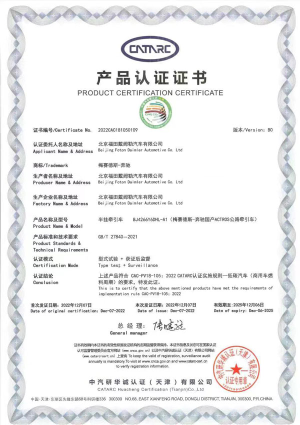 梅賽德斯-奔馳國產(chǎn)重卡Actros 6×4公路牽引車獲“低碳汽車(商用車燃料周期)”認(rèn)證證書