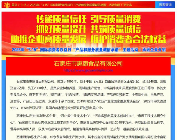 傳遞質(zhì)量信任,引導(dǎo)質(zhì)量消費,近日,由中國質(zhì)量檢驗協(xié)會主辦的2023年3·15國際消費者權(quán)益日“產(chǎn)品和服務(wù)質(zhì)量誠信承諾”主題活動順利召開。在本次活動中,石家莊市惠康食品有限公司憑借優(yōu)質(zhì)的產(chǎn)品質(zhì)量及誠信經(jīng)營榮膺“全國產(chǎn)品和服務(wù)質(zhì)量誠信示范企業(yè)”,““全國預(yù)制菜行業(yè)質(zhì)量領(lǐng)先企業(yè) ”,公司旗下谷言預(yù)制菜系列產(chǎn)品榮獲“全國消費者質(zhì)量信譽保障產(chǎn)品”榮譽。為營造公平、公正、誠信經(jīng)營的市場環(huán)境,樹立質(zhì)量標(biāo)桿、弘揚質(zhì)量先進做出了表率作用。