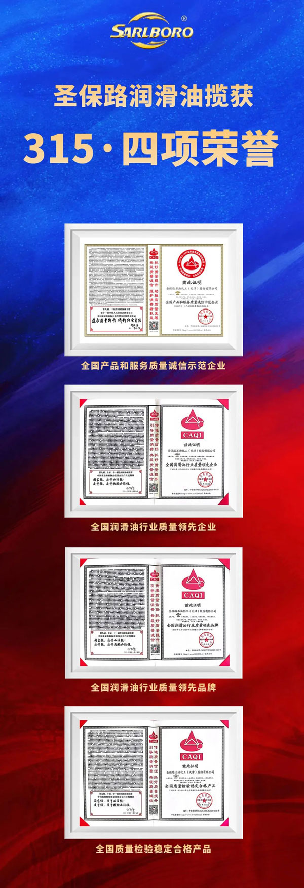 在“3·15”國(guó)際消費(fèi)者權(quán)益日到來之際,圣保路再度榮獲中國(guó)質(zhì)量檢驗(yàn)協(xié)會(huì)頒發(fā)的2023年“全國(guó)產(chǎn)品和服務(wù)質(zhì)量誠(chéng)信示范企業(yè)”、“全國(guó)潤(rùn)滑油行業(yè)質(zhì)量領(lǐng)先企業(yè)”、“全國(guó)潤(rùn)滑油行業(yè)質(zhì)量領(lǐng)先品牌”、“全國(guó)質(zhì)量檢驗(yàn)穩(wěn)定合格產(chǎn)品”四項(xiàng)榮譽(yù)稱號(hào)。