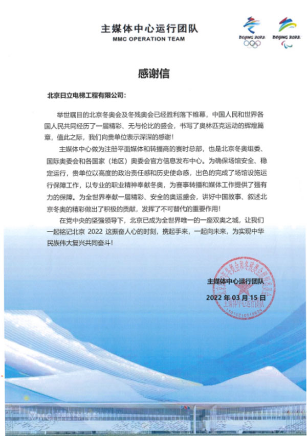 日立電梯還為第24屆北京冬季奧林匹克運動會兩大賽區(qū)6大場館、提供了超過200臺電扶梯產(chǎn)品,包括唯一新建冰上競賽場館“冰絲帶”,并且在長達兩個多月的駐點保障期間達成零故障護航目標,贏得冬奧組委的認可。