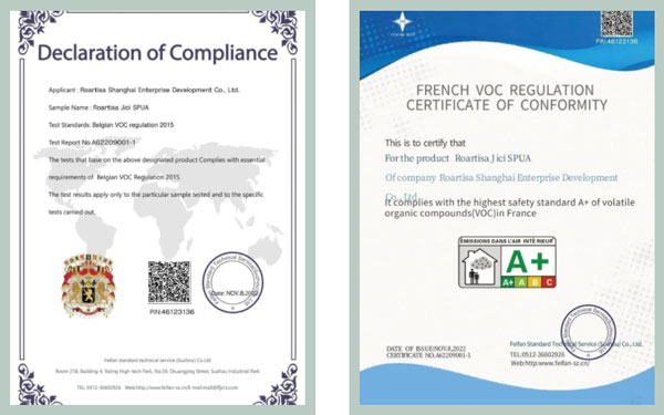 皇氏工匠美縫產(chǎn)品擁有非常全的環(huán)保檢測項目,不僅通過國內(nèi)數(shù)項權(quán)威環(huán)保檢測,還獲得了多項國際環(huán)保認證,包括法國A+認證、比利時皇家認證、德國AgBB等。