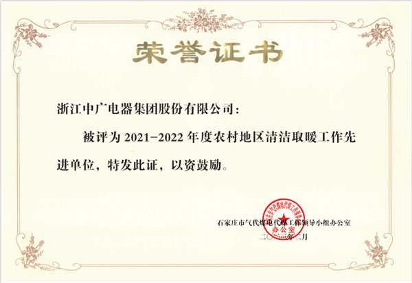 日前,浙江中廣電器集團股份有限公司榮獲由石家莊市氣代煤電代煤工作領導小組辦公室授予的“2021-2022年度農村地區(qū)清潔取暖工作先進單位”榮譽稱號,以此表彰以中廣電器集團在當?shù)剞r村地區(qū)清潔取暖工作中所作出的杰出貢獻。