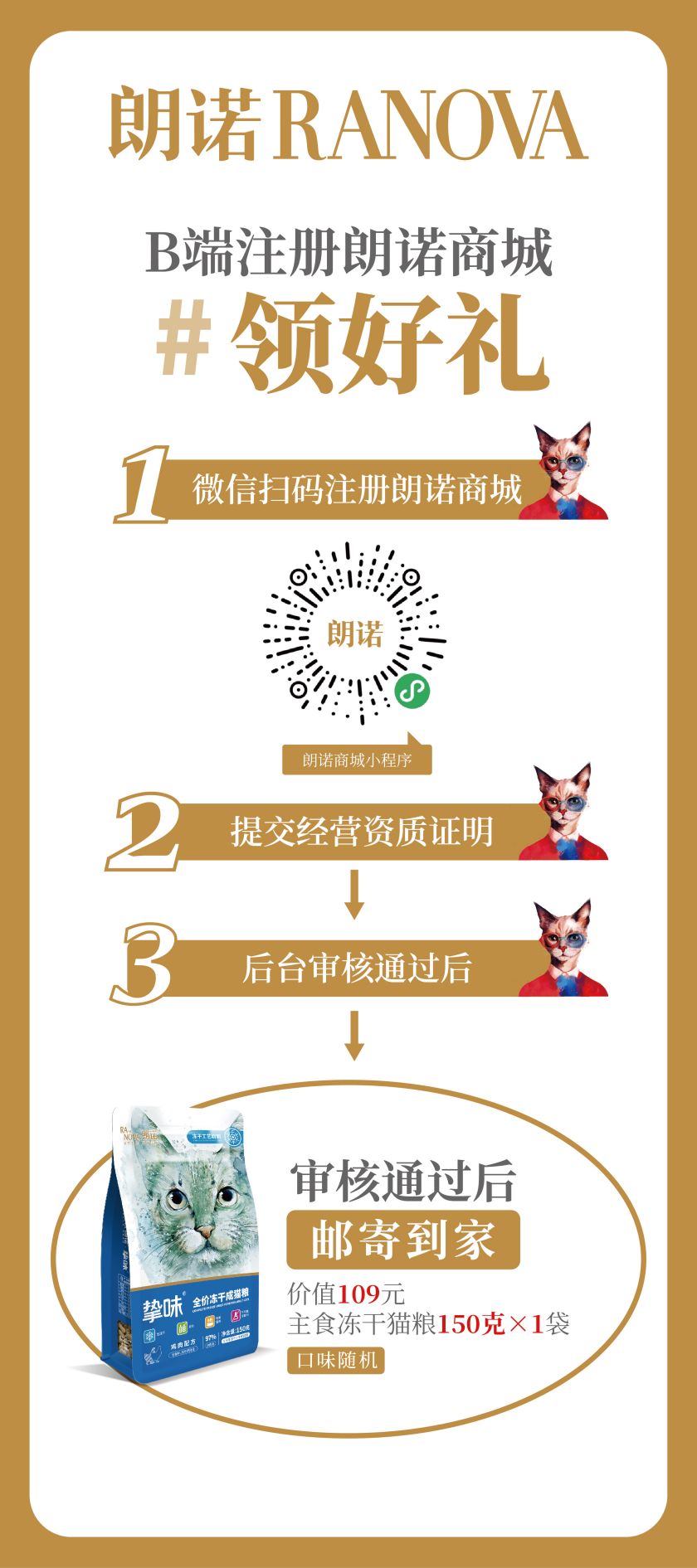 朗諾誠邀各位B端客戶,微信掃碼注冊“朗諾商城”或者微信搜索“朗諾商城”,按步驟上傳資質(zhì),審核通過,即可獲得朗諾準(zhǔn)備的精品好禮一份:朗諾主食凍干150克(口味隨機(jī))一袋,直接包郵到家。同時我們還為“朗諾商城”的各位客戶,定制超值價格政策,進(jìn)貨不費力,敬請期待。