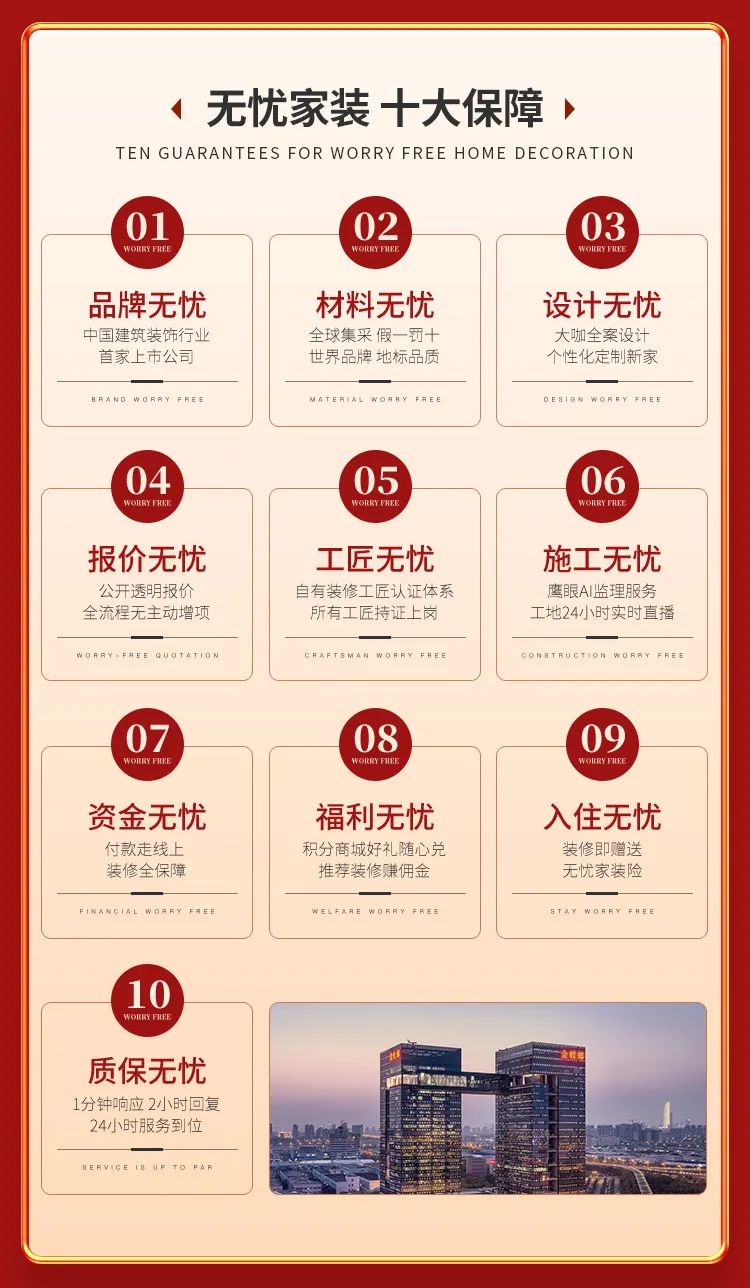 一直以來,金螳螂家高度重視產(chǎn)品質(zhì)量,努力提高服務水平,面向消費者推出無憂家裝十大保障及全線上化家裝服務體驗,基礎工程十年質(zhì)保。我們始終抱著以客戶為中心的初衷,及時為客戶提供全方位優(yōu)質(zhì)服務。為保障用戶合法權益,不斷提高服務質(zhì)量,金螳螂家建立起一套用戶服務監(jiān)督機制并設立客服中心,受理用戶投訴和舉報,以服務熱線4000306888架起服務的橋梁, 為每一個客戶提供售后無憂保障。