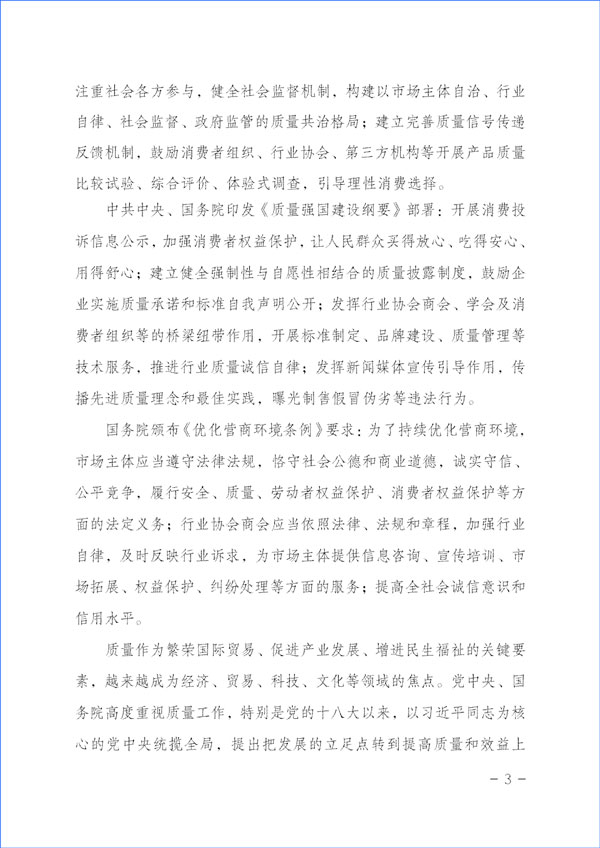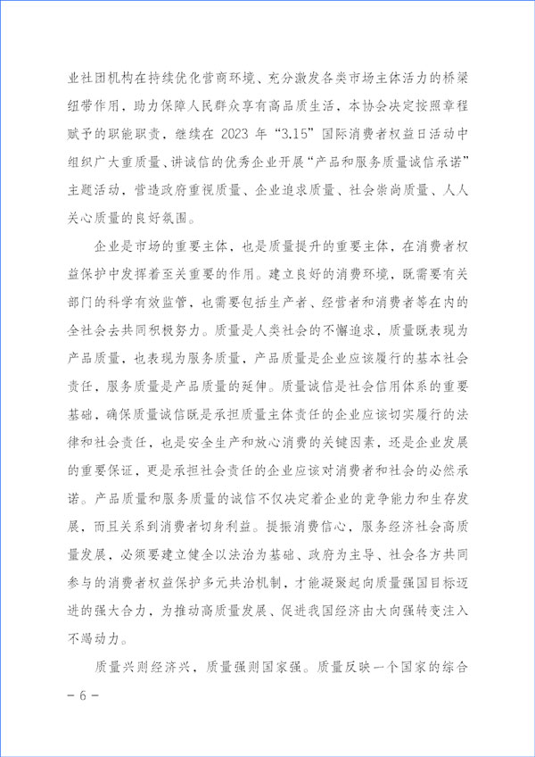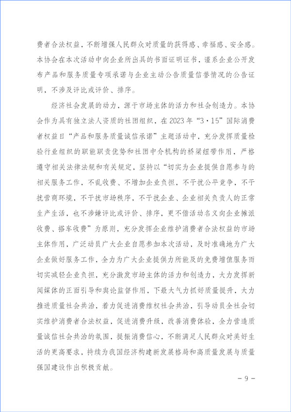 經(jīng)濟(jì)社會(huì)發(fā)展的動(dòng)力,源于市場主體的活力和社會(huì)創(chuàng)造力。本協(xié)會(huì)作為具有獨(dú)立法人資質(zhì)的社團(tuán)組織,在2023年“3·15”國際消費(fèi)者權(quán)益日“產(chǎn)品和服務(wù)質(zhì)量誠信承諾”主題活動(dòng)中,充分發(fā)揮質(zhì)量檢驗(yàn)行業(yè)組織的職能職責(zé)優(yōu)勢和社團(tuán)中介機(jī)構(gòu)的橋梁紐帶作用,嚴(yán)格遵守相關(guān)法律法規(guī)和有關(guān)規(guī)定,堅(jiān)持以“切實(shí)為企業(yè)提供自愿參與的相關(guān)服務(wù)工作,不亂收費(fèi)、不增加企業(yè)負(fù)擔(dān),不干擾公平競爭,不干擾營商環(huán)境,不干擾市場秩序,不干擾企業(yè)、企業(yè)相關(guān)負(fù)責(zé)人的正常生產(chǎn)生活,也不涉嫌評(píng)比或評(píng)價(jià)、排序,更不借活動(dòng)名義向企業(yè)攤派收費(fèi)、搭車收費(fèi)”為原則,充分發(fā)揮企業(yè)維護(hù)消費(fèi)者合法權(quán)益的市場主體作用,廣泛動(dòng)員廣大企業(yè)自愿參加本次活動(dòng),及時(shí)準(zhǔn)確地為廣大企業(yè)做好服務(wù)工作,全力為廣大企業(yè)提供力所能及的免費(fèi)增值服務(wù)而切實(shí)減輕企業(yè)負(fù)擔(dān),充分激發(fā)市場主體的活力和創(chuàng)造力,大力發(fā)揮新聞媒體的正面引導(dǎo)和輿論監(jiān)督作用,下最大氣力抓好質(zhì)量提升,大力推進(jìn)質(zhì)量社會(huì)共治,著力促進(jìn)消費(fèi)維權(quán)社會(huì)共治,引導(dǎo)動(dòng)員全社會(huì)切實(shí)維護(hù)消費(fèi)者合法權(quán)益,促進(jìn)消費(fèi)升級(jí),改善消費(fèi)體驗(yàn),全力營造質(zhì)量誠信社會(huì)共治的氛圍,提振消費(fèi)信心,不斷滿足人民群眾對(duì)美好生活的更高要求,持續(xù)為我國經(jīng)濟(jì)構(gòu)建新發(fā)展格局和高質(zhì)量發(fā)展與質(zhì)量強(qiáng)國建設(shè)作出積極貢獻(xiàn)。