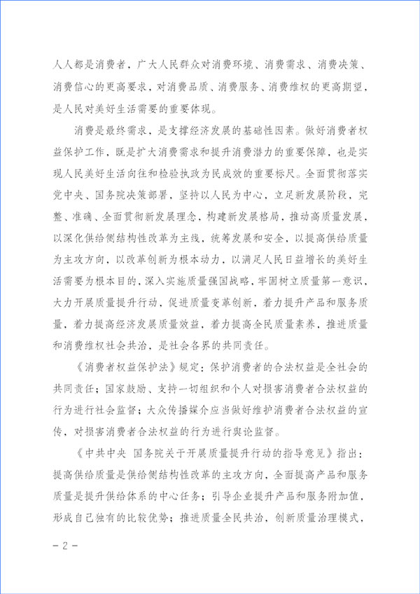 消費(fèi)是最終需求,是支撐經(jīng)濟(jì)發(fā)展的基礎(chǔ)性因素。做好消費(fèi)者權(quán)益保護(hù)工作,既是擴(kuò)大消費(fèi)需求和提升消費(fèi)潛力的重要保障,也是實(shí)現(xiàn)人民美好生活向往和檢驗(yàn)執(zhí)政為民成效的重要標(biāo)尺。全面貫徹落實(shí)黨中央、國務(wù)院決策部署,堅(jiān)持以人民為中心,立足新發(fā)展階段,完整、準(zhǔn)確、全面貫徹新發(fā)展理念,構(gòu)建新發(fā)展格局,推動(dòng)高質(zhì)量發(fā)展,以深化供給側(cè)結(jié)構(gòu)性改革為主線,統(tǒng)籌發(fā)展和安全,以提高供給質(zhì)量為主攻方向,以改革創(chuàng)新為根本動(dòng)力,以滿足人民日益增長的美好生活需要為根本目的,深入實(shí)施質(zhì)量強(qiáng)國戰(zhàn)略,牢固樹立質(zhì)量第一意識(shí),大力開展質(zhì)量提升行動(dòng),促進(jìn)質(zhì)量變革創(chuàng)新,著力提升產(chǎn)品和服務(wù)質(zhì)量,著力提高經(jīng)濟(jì)發(fā)展質(zhì)量效益,著力提高全民質(zhì)量素養(yǎng),推進(jìn)質(zhì)量和消費(fèi)維權(quán)社會(huì)共治,是社會(huì)各界的共同責(zé)任。