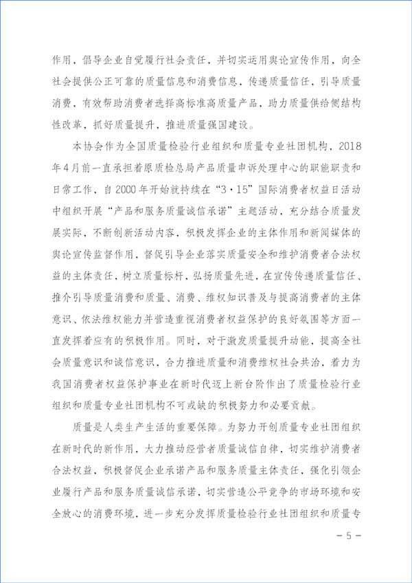 本協(xié)會(huì)作為全國質(zhì)量檢驗(yàn)行業(yè)組織和質(zhì)量專業(yè)社團(tuán)機(jī)構(gòu),2018年4月前一直承擔(dān)著原質(zhì)檢總局產(chǎn)品質(zhì)量申訴處理中心的職能職責(zé)和日常工作,自2000年開始就持續(xù)在“3·15”國際消費(fèi)者權(quán)益日活動(dòng)中組織開展“產(chǎn)品和服務(wù)質(zhì)量誠信承諾”主題活動(dòng),充分結(jié)合質(zhì)量發(fā)展實(shí)際,不斷創(chuàng)新活動(dòng)內(nèi)容,積極發(fā)揮企業(yè)的主體作用和新聞媒體的輿論宣傳監(jiān)督作用,督促引導(dǎo)企業(yè)落實(shí)質(zhì)量安全和維護(hù)消費(fèi)者合法權(quán)益的主體責(zé)任,樹立質(zhì)量標(biāo)桿,弘揚(yáng)質(zhì)量先進(jìn),在宣傳傳遞質(zhì)量信任、推介引導(dǎo)質(zhì)量消費(fèi)和質(zhì)量、消費(fèi)、維權(quán)知識(shí)普及與提高消費(fèi)者的主體意識(shí)、依法維權(quán)能力并營造重視消費(fèi)者權(quán)益保護(hù)的良好氛圍等方面一直發(fā)揮著應(yīng)有的積極作用。同時(shí),對(duì)于激發(fā)質(zhì)量提升動(dòng)能,提高全社會(huì)質(zhì)量意識(shí)和誠信意識(shí),合力推進(jìn)質(zhì)量和消費(fèi)維權(quán)社會(huì)共治,著力為我國消費(fèi)者權(quán)益保護(hù)事業(yè)在新時(shí)代邁上新臺(tái)階作出了質(zhì)量檢驗(yàn)行業(yè)組織和質(zhì)量專業(yè)社團(tuán)機(jī)構(gòu)不可或缺的積極努力和必要貢獻(xiàn)。
