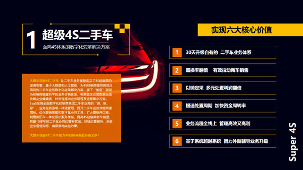 多年來,268V檢測系統(tǒng)已經在全國經銷商中普及,累計檢測數(shù)百萬車輛。如今,該系統(tǒng)進一步融入云計算、人工智能、圖像識別、語音識別等先進技術,可以實現(xiàn)全程無人化和更高的檢測效率與精準度。在此基礎上,車易拍聚合大搜車的SaaS能力和自身的交易拍賣能力,推出了超級4S二手車這一數(shù)字化變革解決方案,通過對進、銷、存、管的全面數(shù)字化,有效推動經銷商內部工作流程的規(guī)范化和提升運營效率。