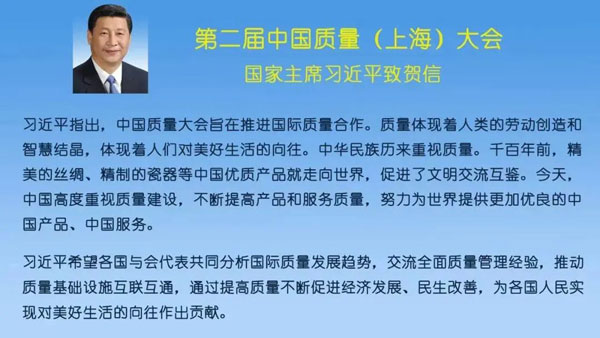金秋時節(jié)的黃浦江邊,中國質量(上海)大會如約而至。國家主席習近平給大會發(fā)來賀信,對大會的召開表示熱烈的祝賀。