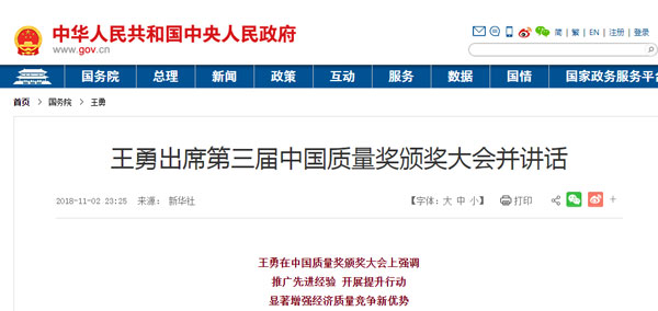 11月2日,第三屆中國質量獎頒獎大會在京召開。