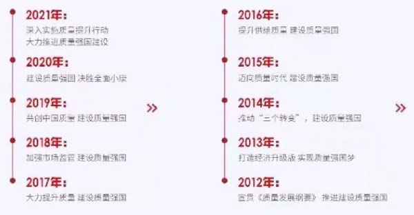 同樣是在2012年,國務院頒布實施《質量發(fā)展綱要(2011-2020年)》,強調“質量發(fā)展是興國之道、強國之策”,并提出“面對新形勢、新挑戰(zhàn),堅持以質取勝,建設質量強國”。