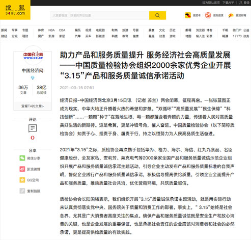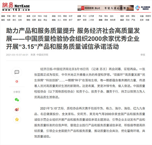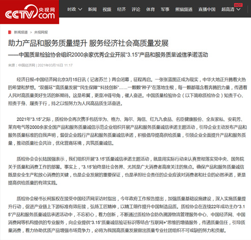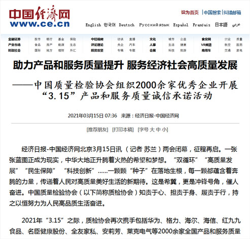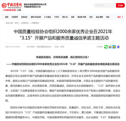 中國經(jīng)濟網(wǎng):傳遞質(zhì)量信任、引導(dǎo)質(zhì)量消費,我們堅持在行動!——中國質(zhì)量檢驗協(xié)會組織2000余家優(yōu)秀企業(yè)在2021年“3.15”開展產(chǎn)品和服務(wù)質(zhì)量誠信承諾主題活動