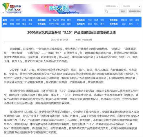 中國青年網(wǎng):2000余家優(yōu)秀企業(yè)開展“3.15”產(chǎn)品和服務(wù)質(zhì)量誠信承諾活動