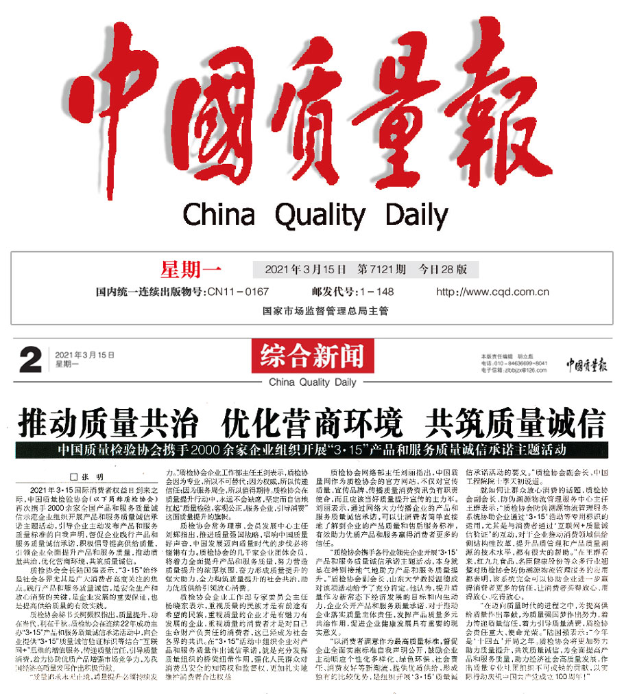 中國質(zhì)量報(3月15日刊第2版):推動質(zhì)量共治 優(yōu)化營商環(huán)境 共筑質(zhì)量誠信——中國質(zhì)量檢驗協(xié)會攜手2000余家企業(yè)組織開展“3 ·15”產(chǎn)品和服務(wù)質(zhì)量誠信承諾主題活動