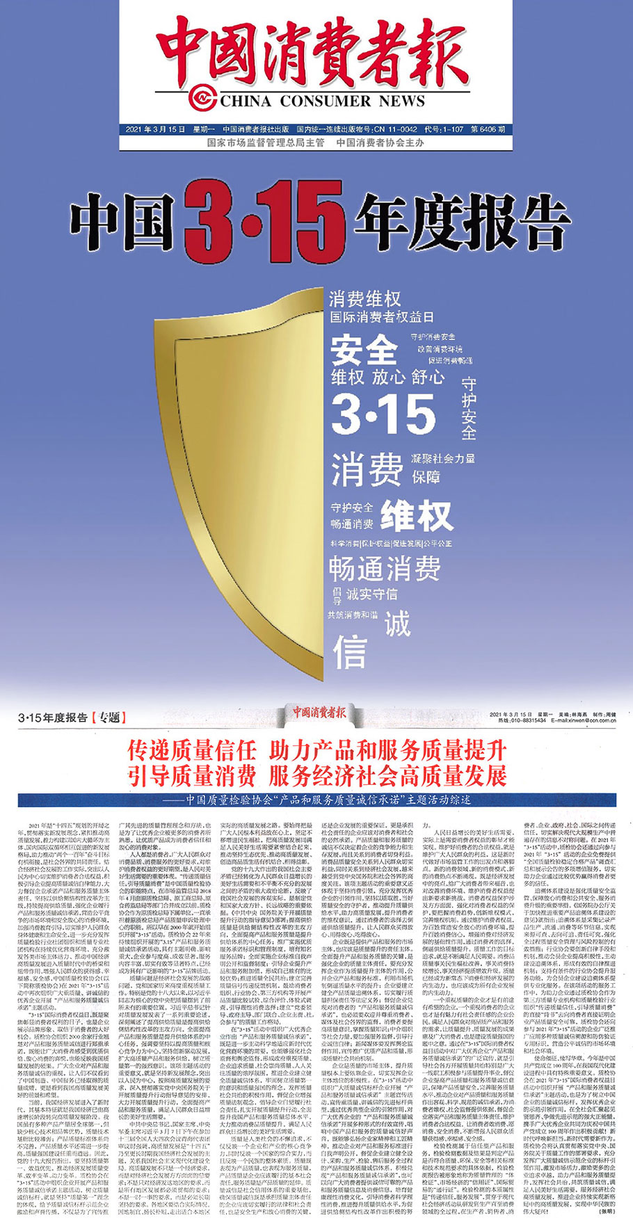 中國消費者報(3月15日刊第4版):傳遞質(zhì)量信任 助力產(chǎn)品和服務(wù)質(zhì)量提升 引導(dǎo)質(zhì)量消費 服務(wù)經(jīng)濟社會高質(zhì)量發(fā)展——中國質(zhì)量檢驗協(xié)會組織開展2021年“3.15”國際消費者權(quán)益日“產(chǎn)品和服務(wù)質(zhì)量誠信承諾”主題活動綜述