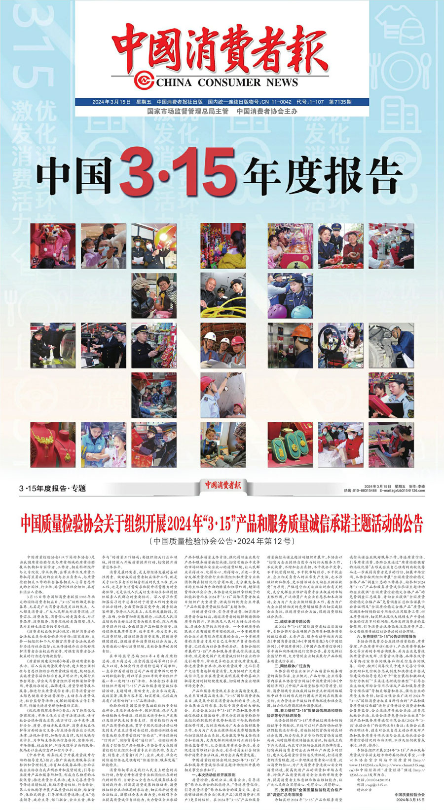 中國消費(fèi)者報(bào):中國質(zhì)量檢驗(yàn)協(xié)會關(guān)于組織開展2024年“3·15”產(chǎn)品和服務(wù)質(zhì)量誠信承諾主題活動的公告
