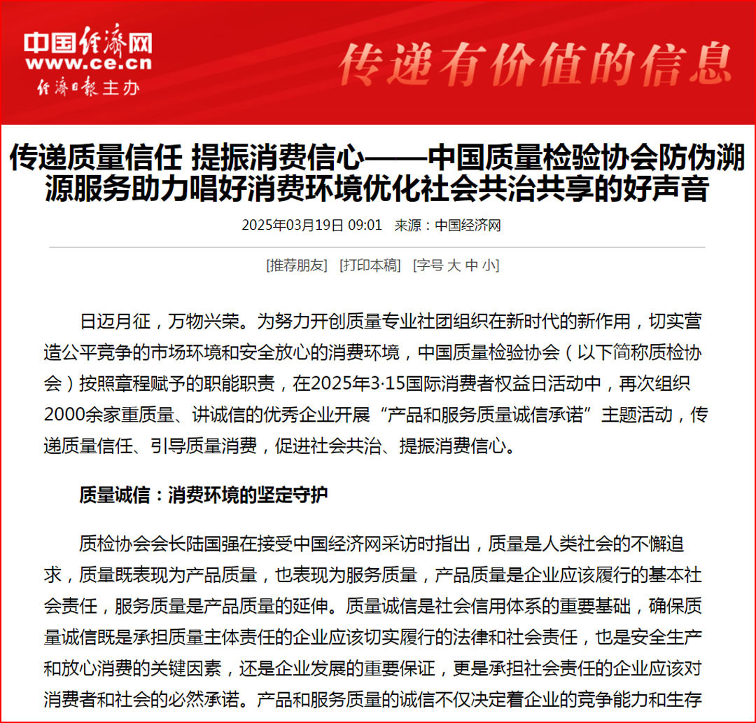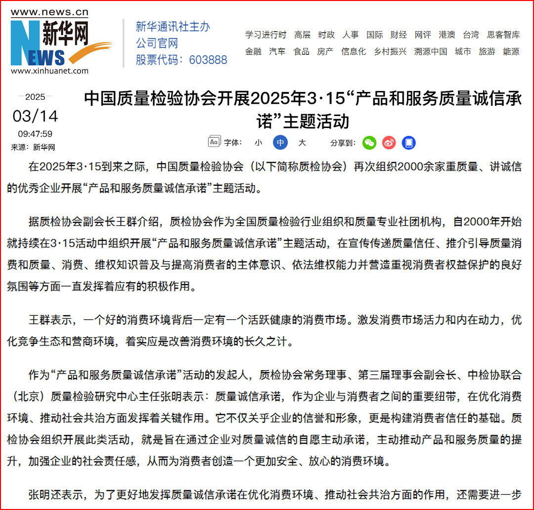 中國經(jīng)濟(jì)網(wǎng)“質(zhì)量經(jīng)濟(jì)頻道”發(fā)布:質(zhì)量誠信承諾助力消費(fèi)環(huán)境優(yōu)化社會(huì)共治——中國質(zhì)量檢驗(yàn)協(xié)會(huì)組織2025年3·15“產(chǎn)品和服務(wù)質(zhì)量誠信承諾”主題活動(dòng)