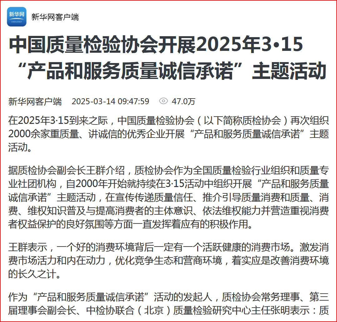 網(wǎng)易網(wǎng)報(bào)道:質(zhì)量誠信承諾助力消費(fèi)環(huán)境優(yōu)化社會(huì)共治——中國質(zhì)量檢驗(yàn)協(xié)會(huì)組織2025年3·15“產(chǎn)品和服務(wù)質(zhì)量誠信承諾”主題活動(dòng)
